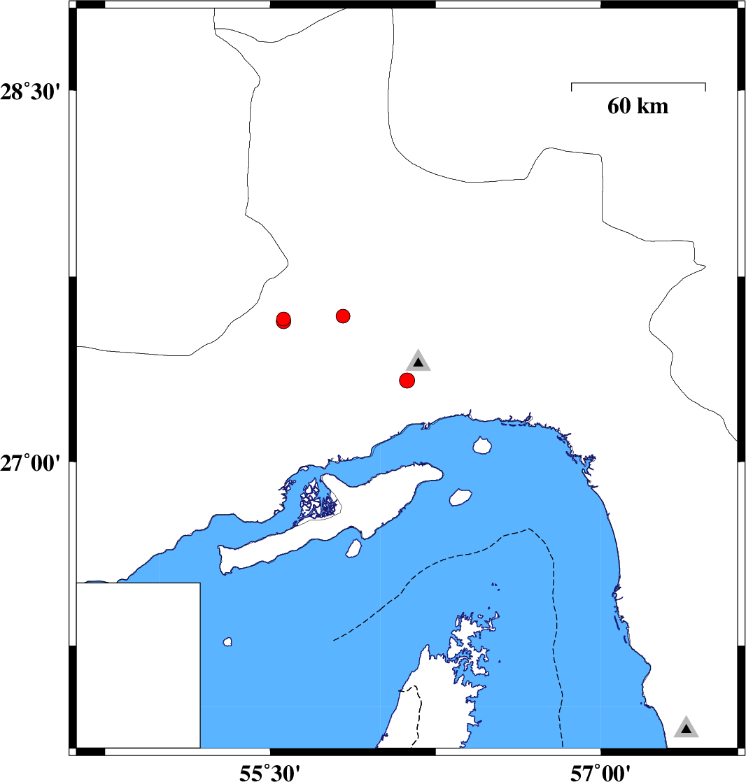 2007/12/17 | 16:23:54.8 | 19:53:54.8 | 27.57 | 55.56 | 15 | ML:2.9 | 83 km North-West of Bandar-e abbas, Hormozgan Province | ||