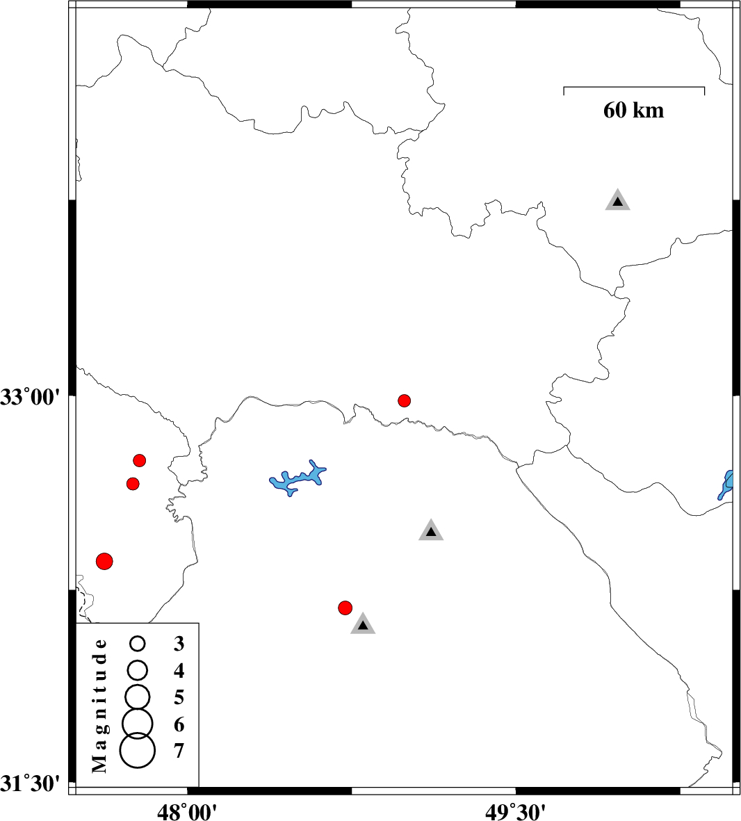 | 2007/12/19 | 18:07:52.3 | 21:37:52.3 | 32.98 | 48.99 | 16 | ML:2.5 | 56 km South of Dorud, Lorestan Province | ||