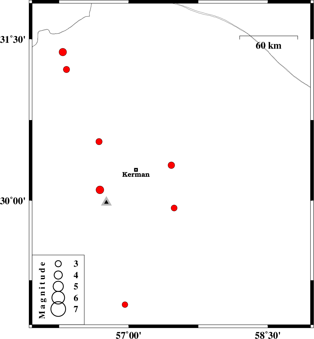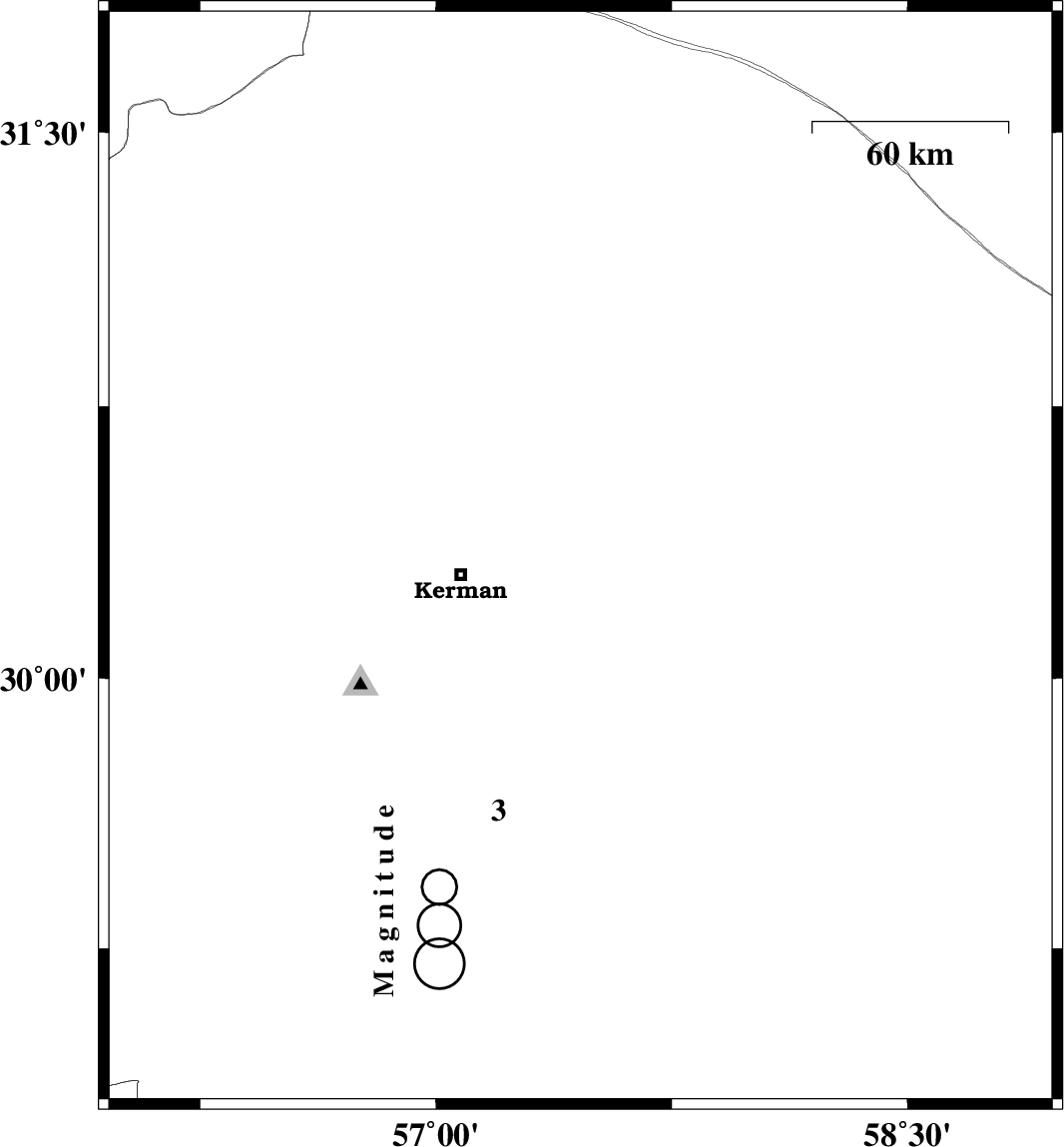 | 2007/12/13 | 01:05:05.1 | 04:35:05.1 | 29.93 | 57.49 | 15 | ML:2.9 | 55 km South-East of Kerman, Kerman Province | ||