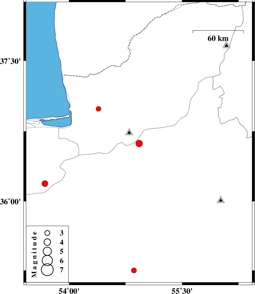 | 2007/12/10 | 23:49:56.8 | 03:19:56.8 | 36.99 | 54.39 | 14 | ML:2.9 | 6 km Aq Qaleh, Golestan Province | ||