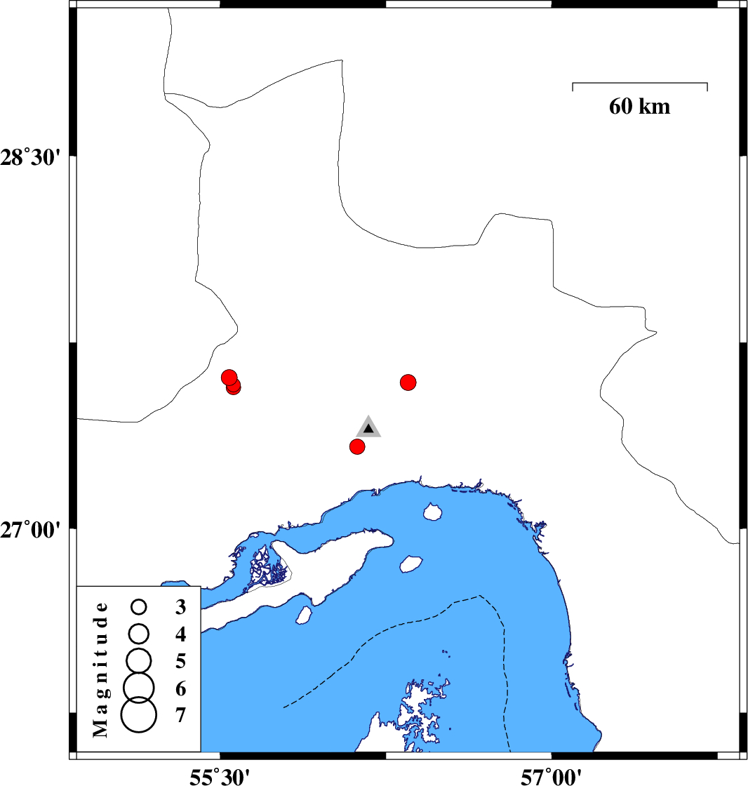 | 2007/12/17 | 16:23:54.8 | 19:53:54.8 | 27.57 | 55.56 | 15 | ML:2.9 | 83 km North-West of Bandar-e abbas, Hormozgan Province |