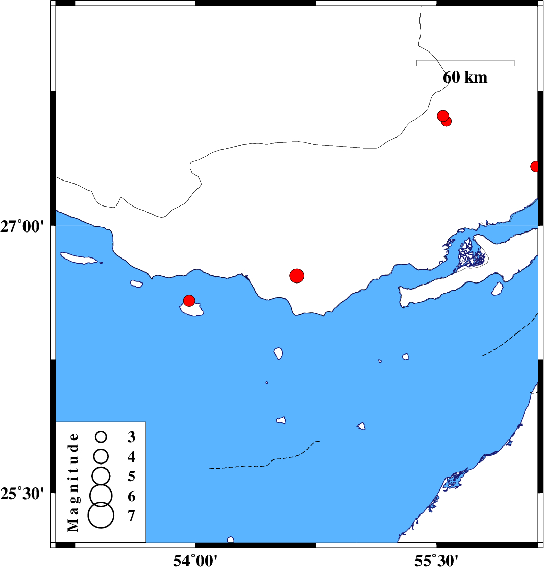| 2007/12/25 | 13:15:50.3 | 16:45:50.3 | 26.72 | 54.63 | 14 | ML:3.9 | 29 km North-West of Bandar-e lengeh, Hormozgan Province | ||