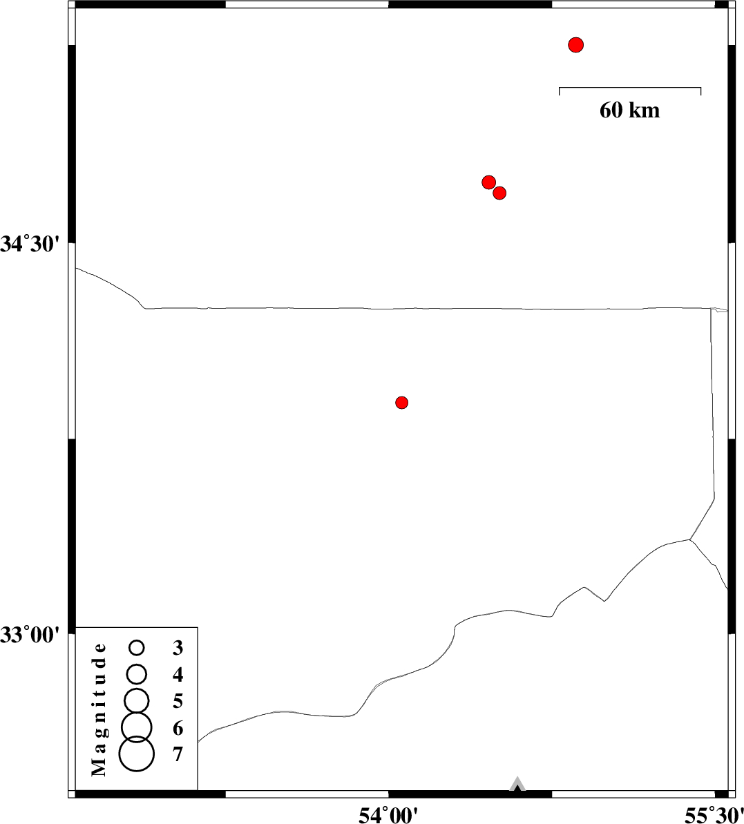 | 2007/12/26 | 18:35:38.0 | 22:05:38.0 | 33.89 | 54.06 | 14 | ML:2.6 | 144 km North-East of Nain, Esfahan Province | ||