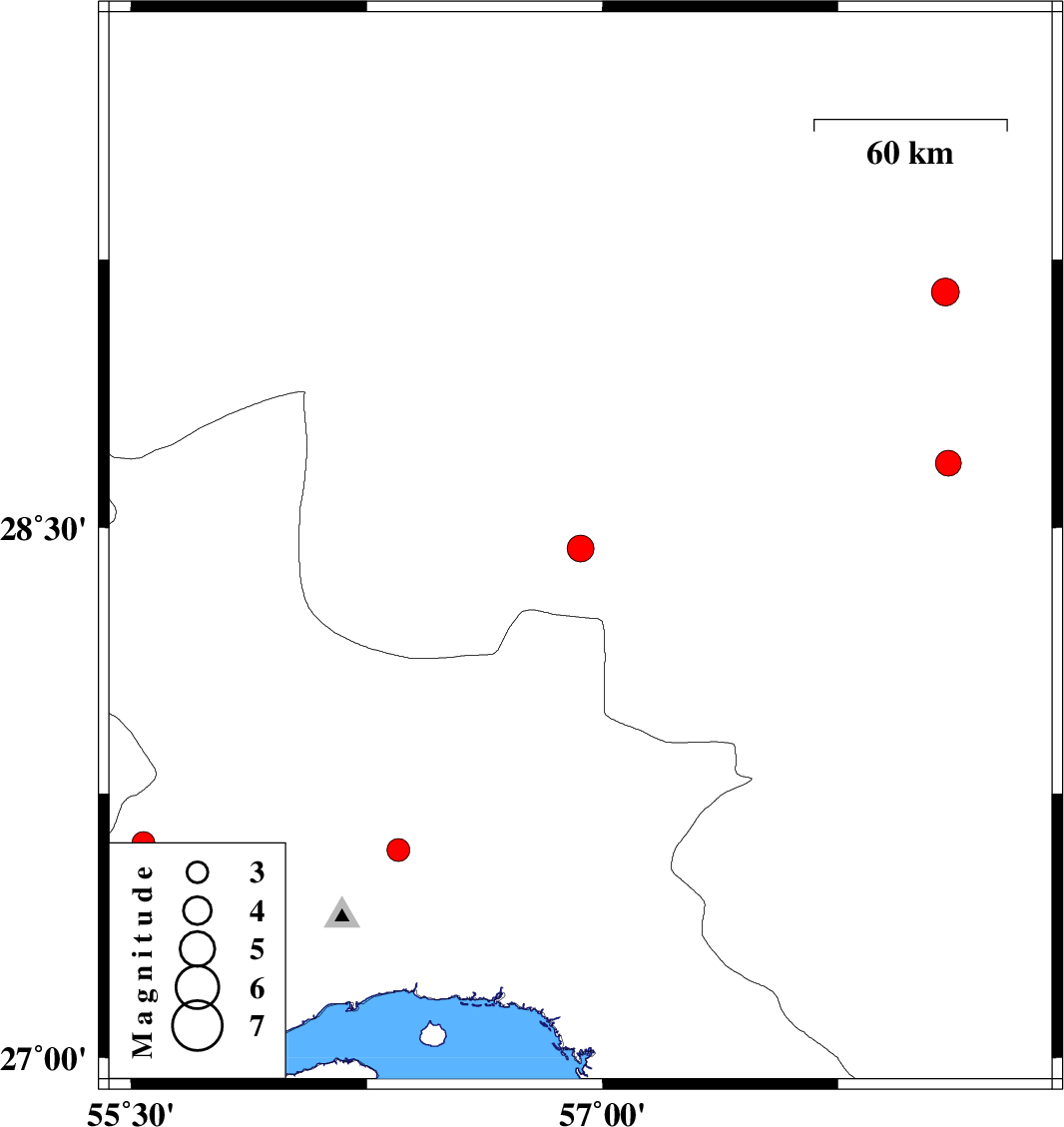 | 2007/12/20 | 18:16:26.4 | 21:46:26.4 | 27.61 | 55.54 | 14 | ML:3.3 | 85 km South-West of Hajiabad, Hormozgan Province |