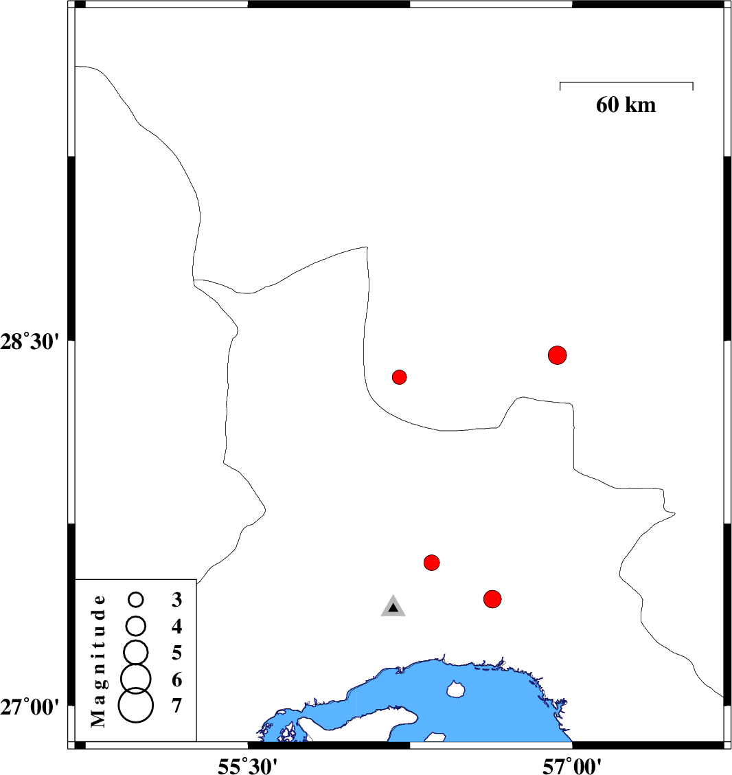 | 2007/12/28 | 17:11:41.2 | 20:41:41.2 | 27.44 | 56.63 | 13 | ML:3.7 | 44 km North-East of Bandar-e abbas, Hormozgan Province | ||