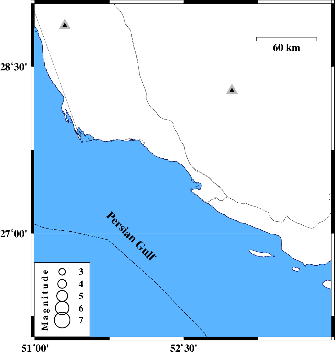 | 2007/12/29 | 02:58:43.4 | 06:28:43.4 | 27.56 | 52.49 | 31 | ML:2.8 | Persian Gulf, 35 km South-East of Jam |