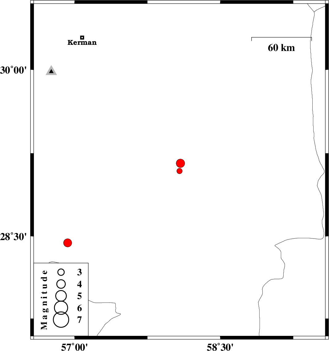 | 2007/12/25 | 15:34:52.9 | 19:04:52.9 | 29.16 | 58.09 | 14 | ML:4 | 26 km West of Bam, Kerman Province |