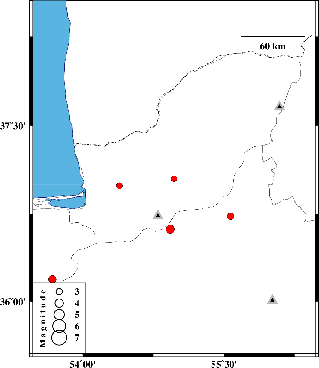 | 2007/12/10 | 23:49:56.8 | 03:19:56.8 | 36.99 | 54.39 | 14 | ML:2.9 | 6 km Aq Qaleh, Golestan Province |