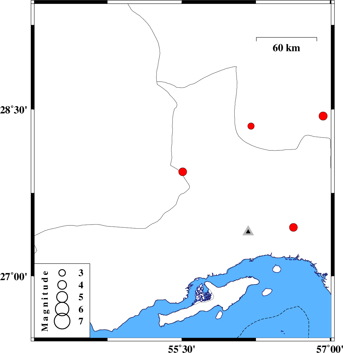 | 2007/12/28 | 17:11:41.2 | 20:41:41.2 | 27.44 | 56.63 | 13 | ML:3.7 | 44 km North-East of Bandar-e abbas, Hormozgan Province | ||