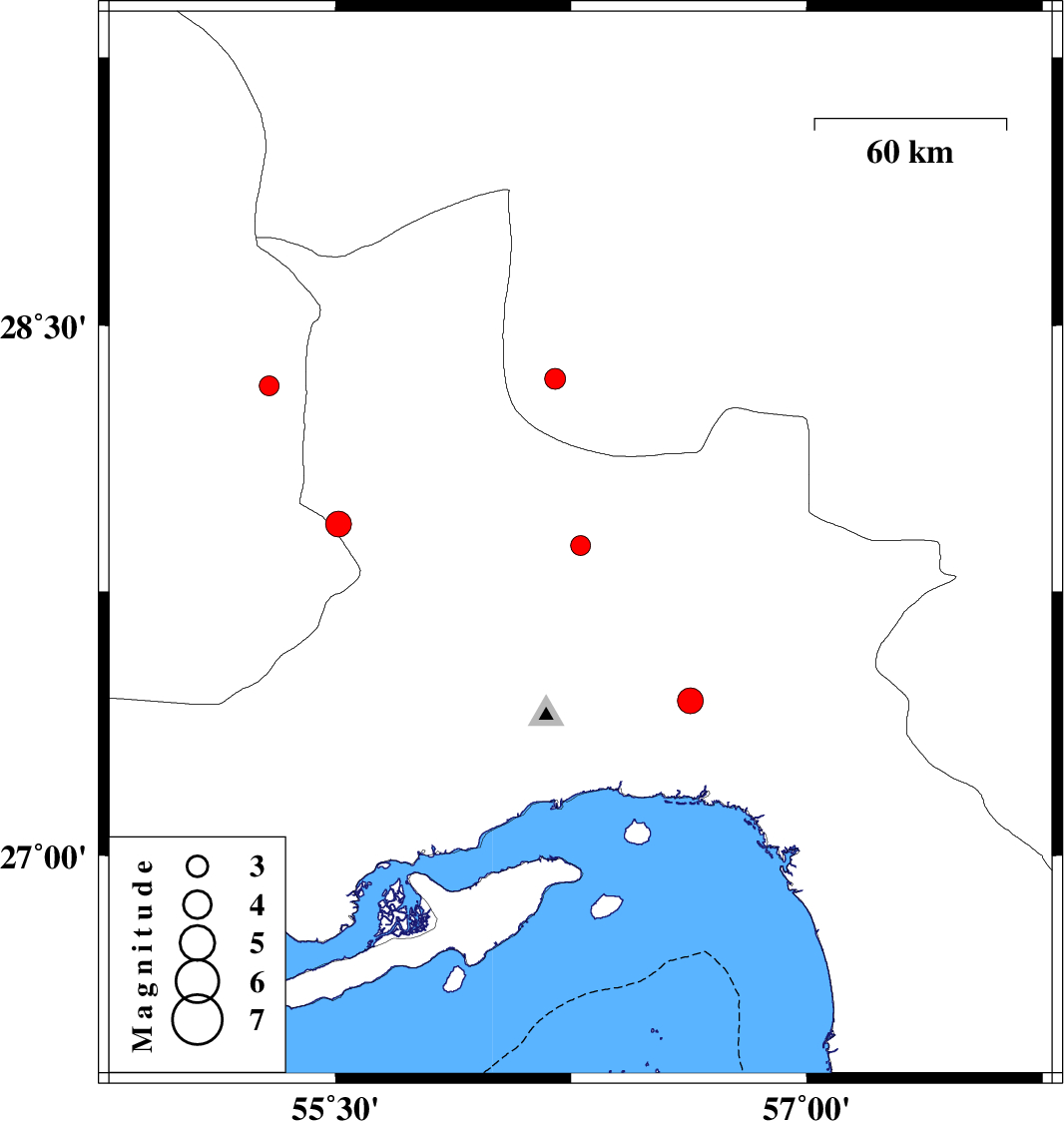 | 2007/12/28 | 17:11:41.2 | 20:41:41.2 | 27.44 | 56.63 | 13 | ML:3.7 | 44 km North-East of Bandar-e abbas, Hormozgan Province |