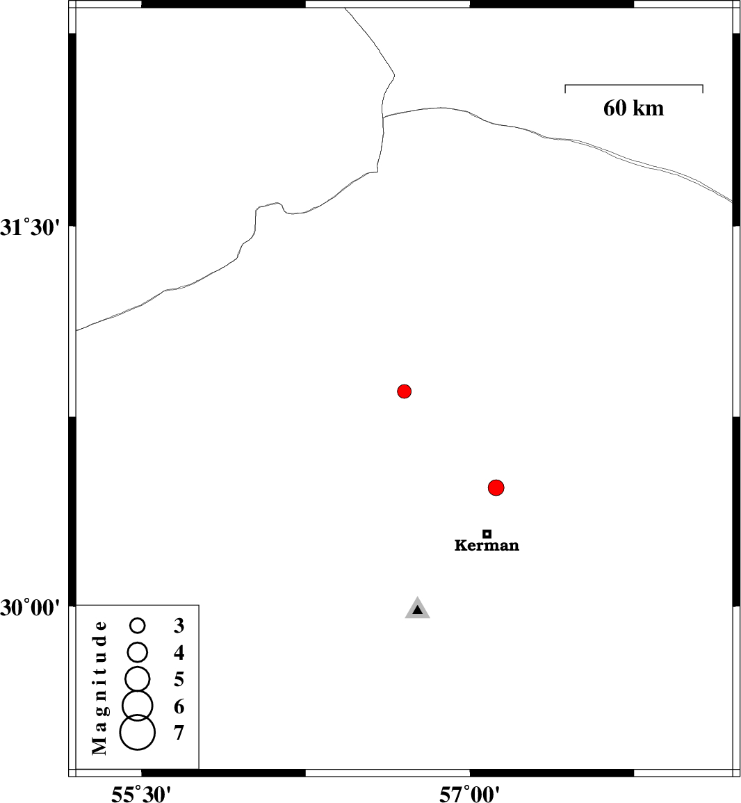 | 2007/12/31 | 05:04:50.2 | 08:34:50.2 | 30.47 | 57.12 | 10 | ML:3.2 | 21 km North of Kerman, Kerman Province |