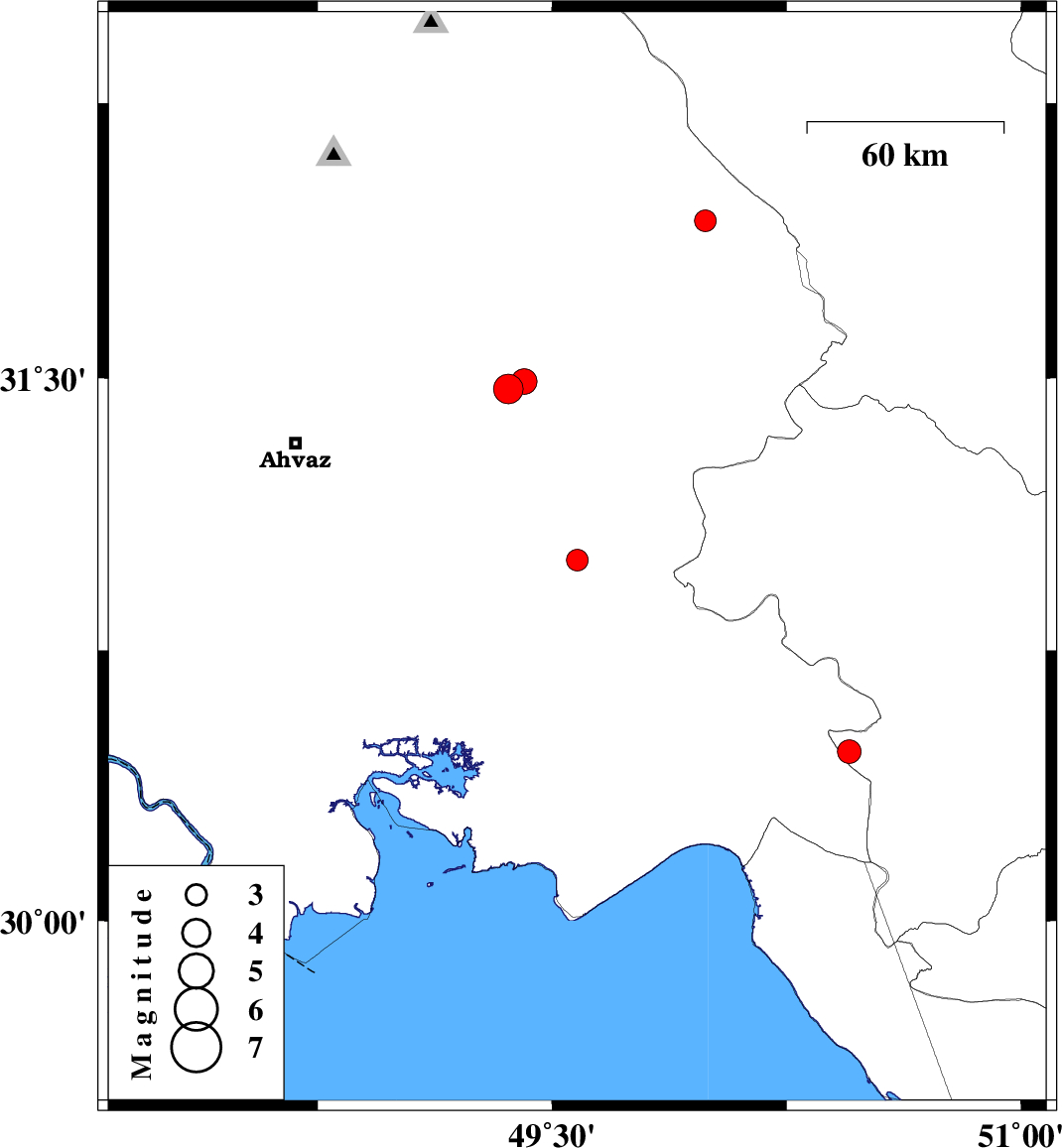 | 2008/01/05 | 07:09:48.8 | 10:39:48.8 | 31.49 | 49.41 | 26 | ML:3.7 | 30 km North-West of Ramhormoz, Khoozestan Province |