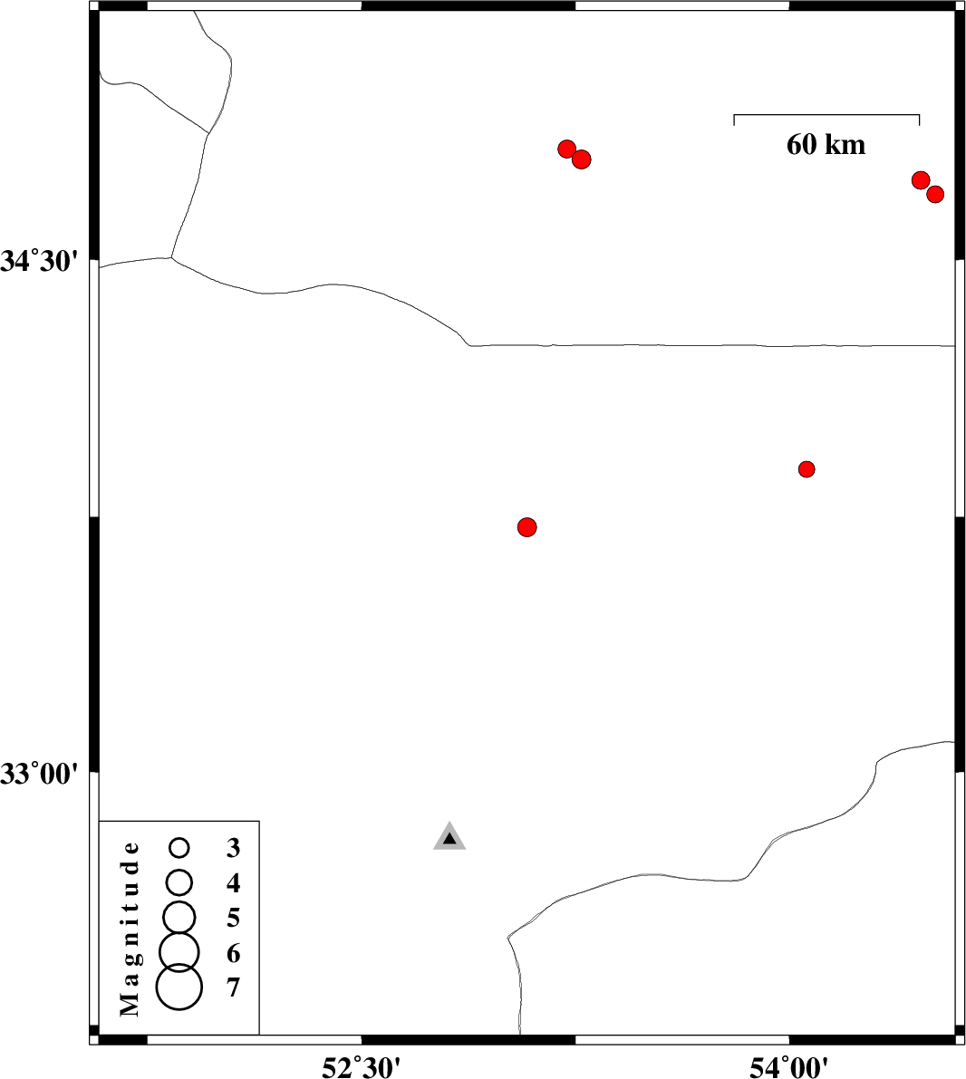 | 2008/01/09 | 00:30:12.1 | 04:00:12.1 | 34.79 | 53.27 | 14 | ML:2.9 | 86 km South-West of Semnan, Semnan Province | ||
