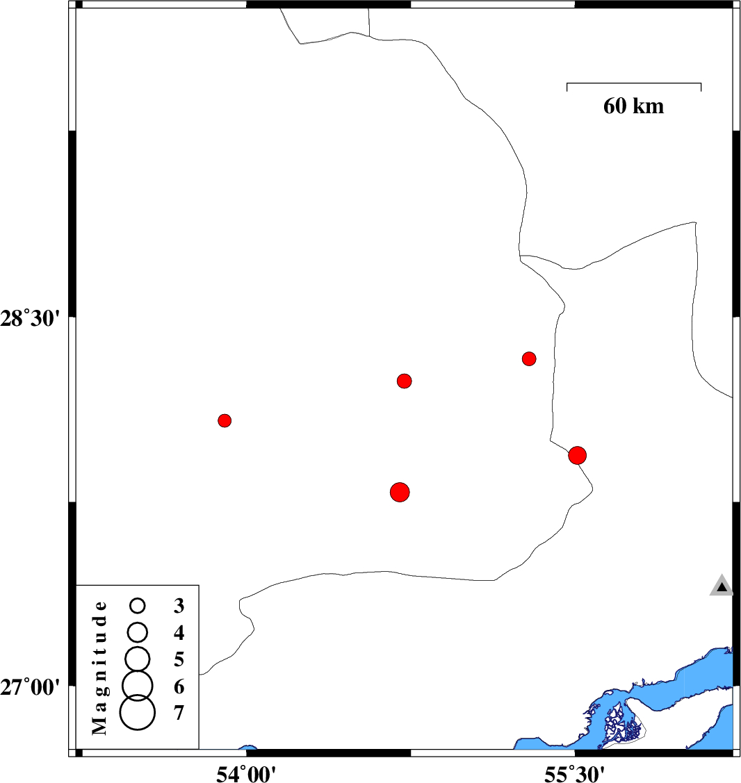 | 2008/01/05 | 00:37:47.2 | 04:07:47.2 | 27.79 | 54.7 | 14 | ML:4 | 37 km North-East of Lar, Fars Province | ||