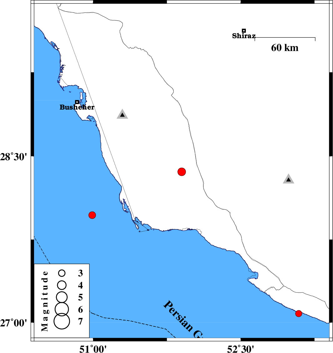 | 2008/01/04 | 00:04:08.1 | 03:34:08.1 | 27.08 | 53.09 | 26 | ML:2.9 | Persian Gulf, 29 km South of Lamerd |