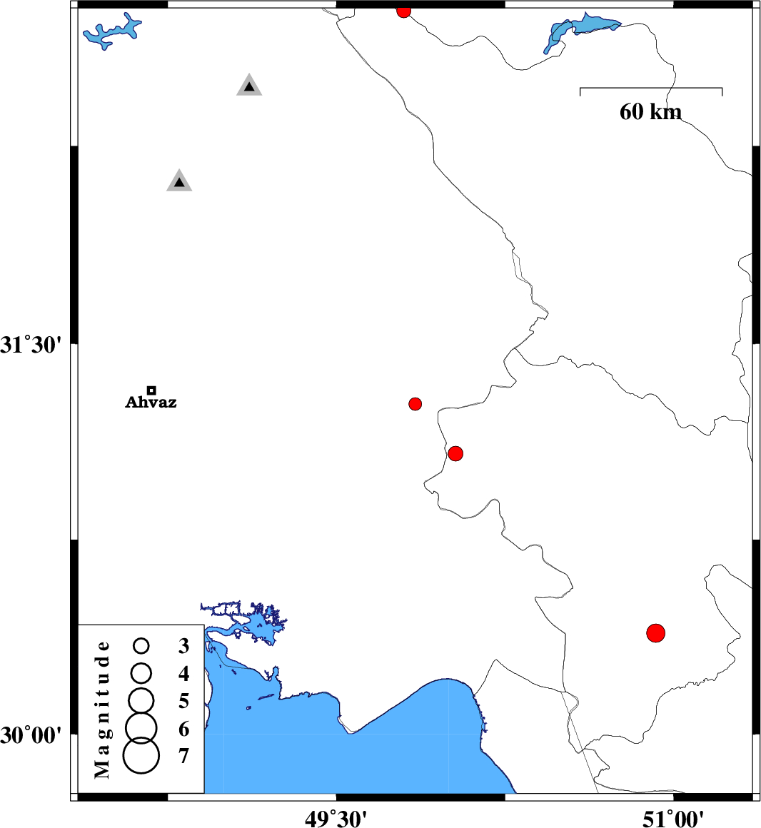 | 2008/01/16 | 00:10:08.1 | 03:40:08.1 | 31.08 | 50.03 | 41 | ML:2.9 | 45 km South-East of Ramhormoz, Khoozestan Province |