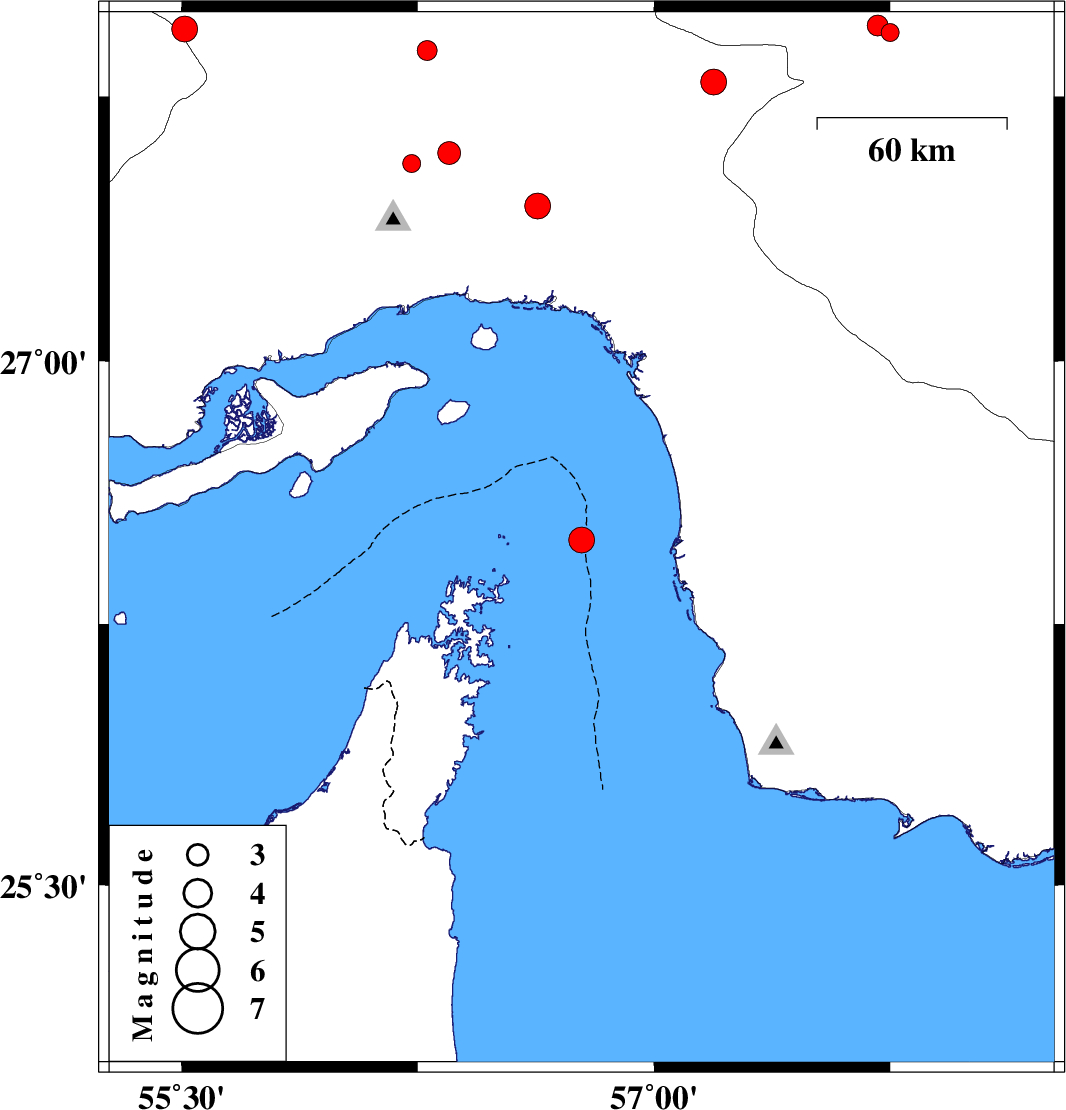 | 2008/01/23 | 22:09:19.3 | 01:39:19.3 | 26.49 | 56.77 | 18 | ML:3.6 | Oman Sea, 72 km South-East of Qeshm | ||