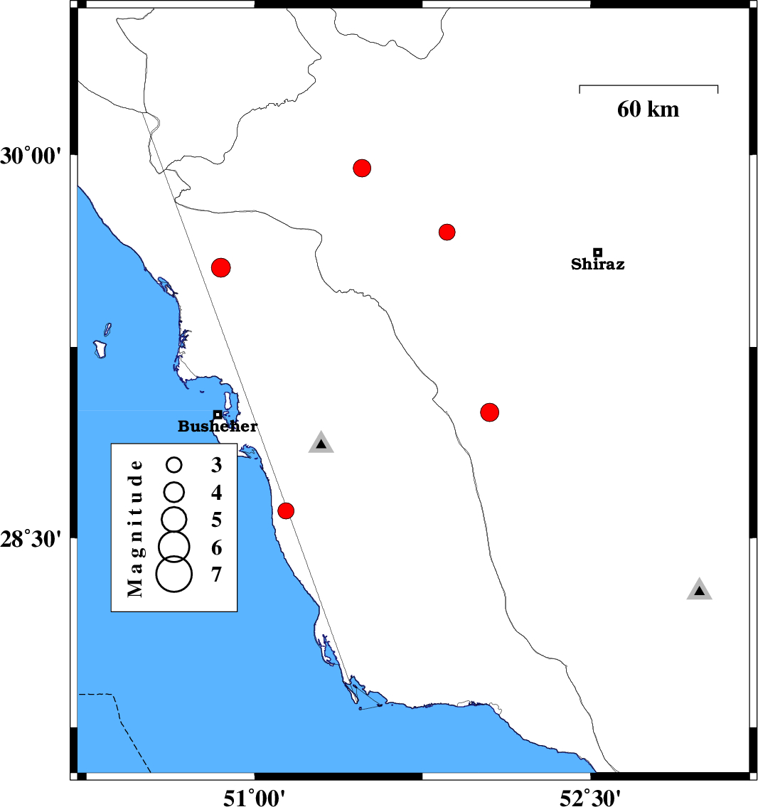 | 2008/01/23 | 11:21:25.9 | 14:51:25.9 | 28.93 | 50.7 | 45 | ML:3.8 | Persian Gulf, 14 km West of Busheher | ||