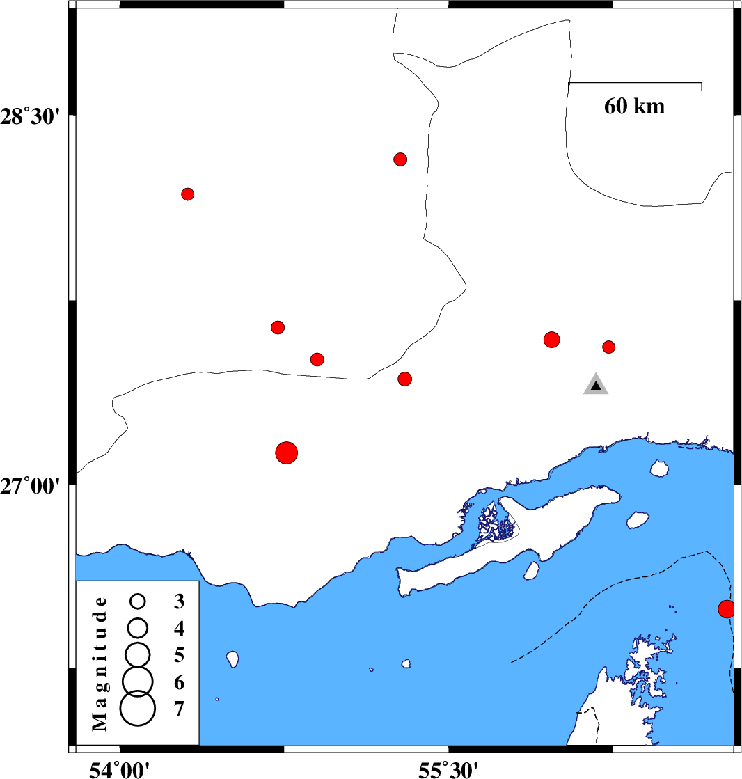 | 2008/01/23 | 22:09:19.3 | 01:39:19.3 | 26.49 | 56.77 | 18 | ML:3.6 | Oman Sea, 72 km South-East of Qeshm | ||