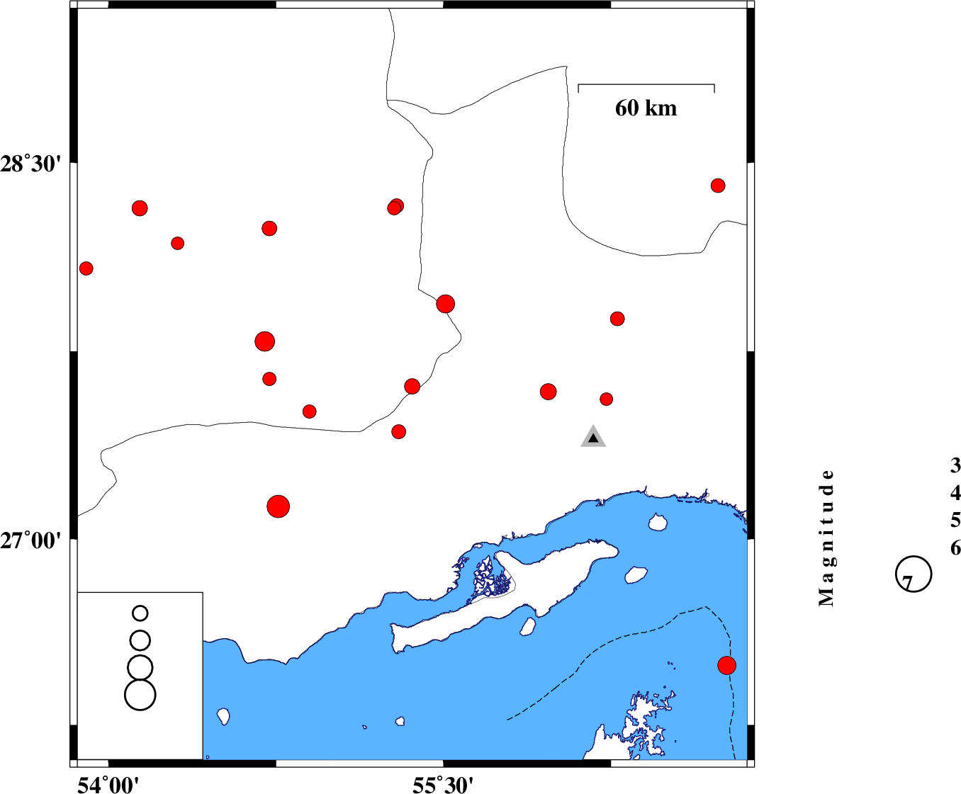 2008/01/03 | 06:48:06.0 | 10:18:06.0 | 27.94 | 55.51 | 31 | ML:3.6 | 56 km South-West of Hajiabad, Hormozgan Province |