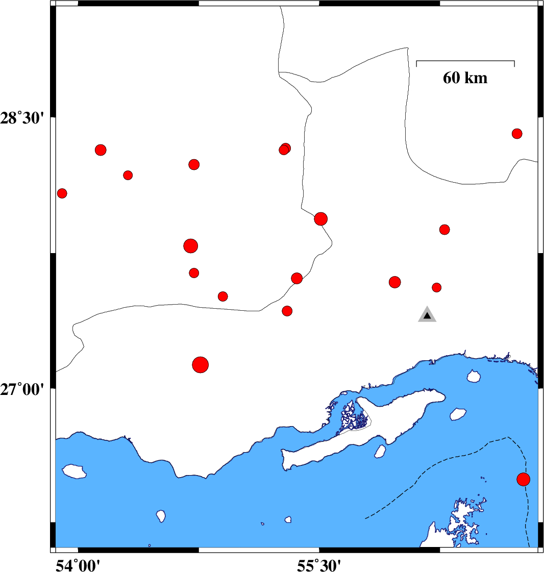 2008/01/23 | 22:09:19.3 | 01:39:19.3 | 26.49 | 56.77 | 18 | ML:3.6 | Oman Sea, 72 km South-East of Qeshm | ||