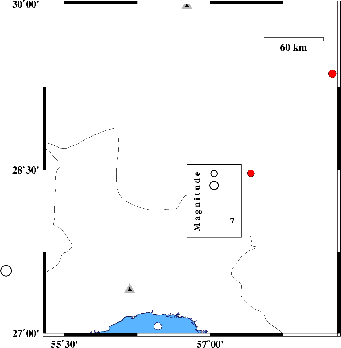 | 2008/01/30 | 03:56:21.9 | 07:26:21.9 | 27.61 | 55.36 | 14 | ML:3.1 | 93 km South-West of Hajiabad, Hormozgan Province | ||