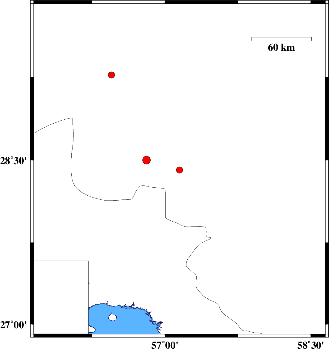 | 2008/01/31 | 14:11:32.8 | 17:41:32.8 | 28.5 | 56.81 | 23 | ML:3.6 | 84 km South-East of Baft, Kerman Province | ||