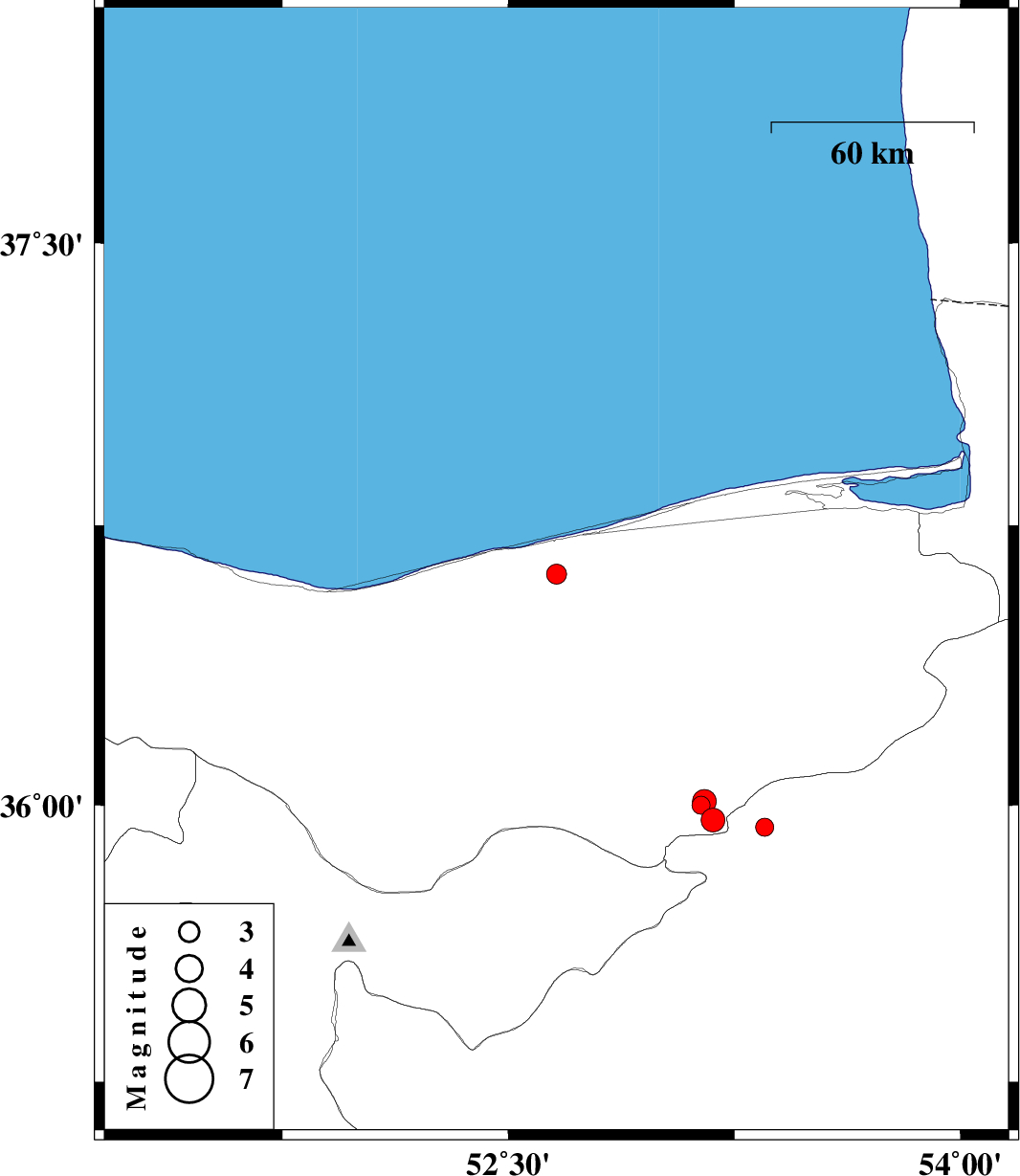 | 2008/02/03 | 13:16:19.7 | 16:46:19.7 | 36.62 | 52.66 | 15 | ML:2.9 | 8 km Babolsar, Mazandaran Province | ||