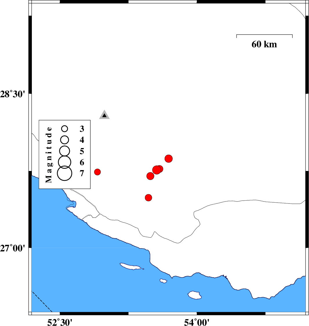 2008/02/07 | 20:20:07.8 | 23:50:07.8 | 27.49 | 53.47 | 46 | ML:3.4 | 34 km North-East of Lamerd, Fars Province | ||