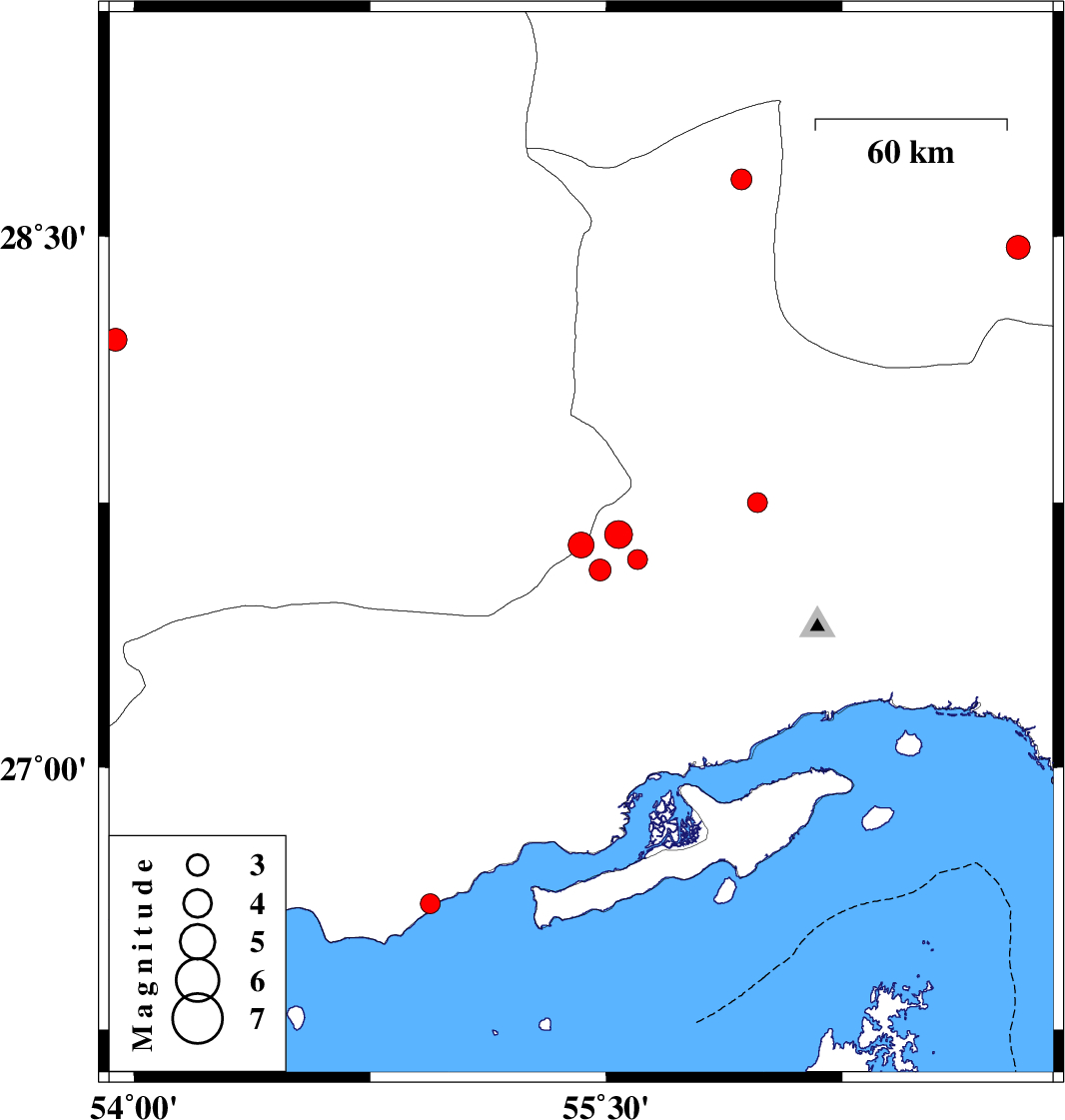 2008/02/11 | 10:35:14.1 | 14:05:14.1 | 27.56 | 55.48 | 14 | ML:3.1 | 89 km North-West of Bandar-e abbas, Hormozgan Province | ||
