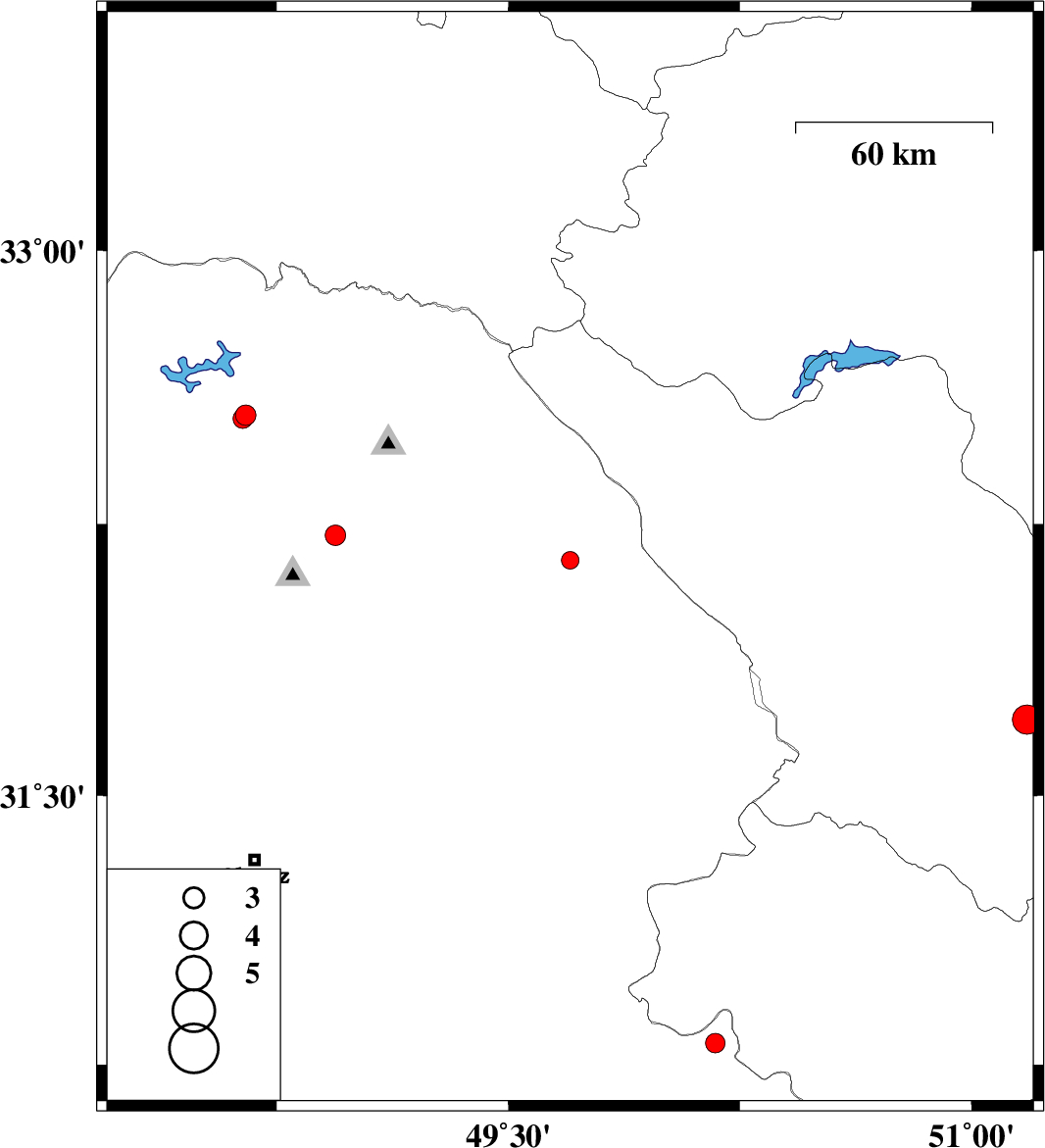 2008/02/26 | 04:00:31.2 | 07:30:31.2 | 32.15 | 49.7 | 14 | ML:2.6 | 38 km North-West of Izeh, Khoozestan Province | ||