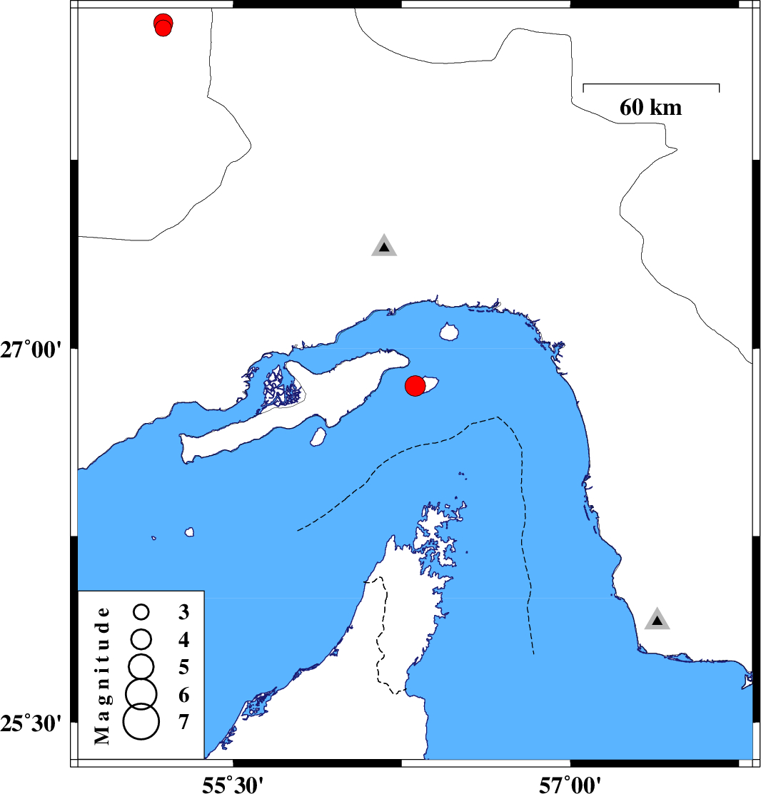 | 2008/03/01 | 16:38:55.6 | 20:08:55.6 | 26.85 | 56.31 | 14 | ML:4.1 | Persian Gulf, 12 km South of Qeshm | ||