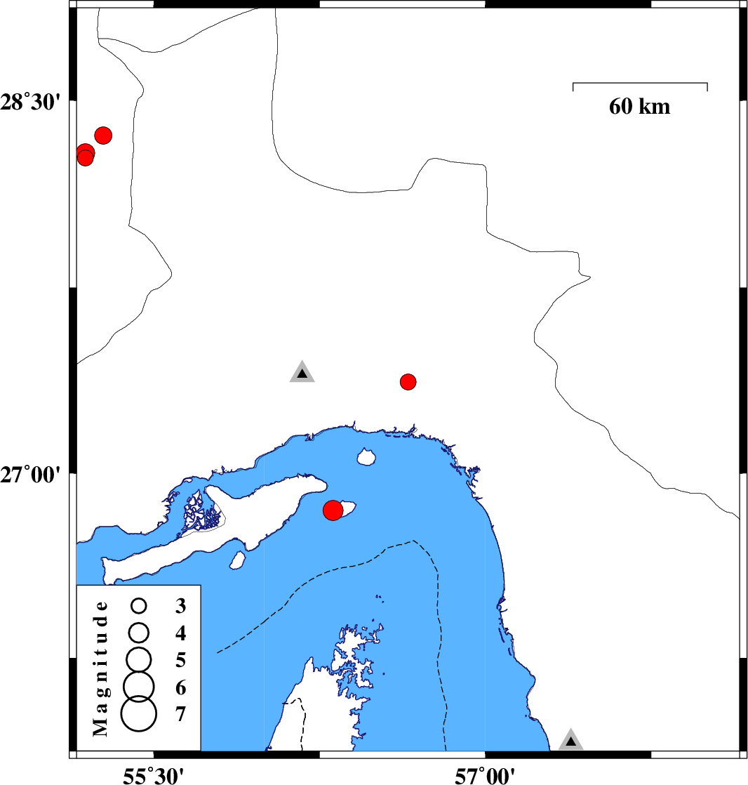 | 2008/02/28 | 08:46:58.7 | 12:16:58.7 | 28.36 | 55.27 | 15 | ML:3.5 | 62 km West of Hajiabad, Hormozgan Province |