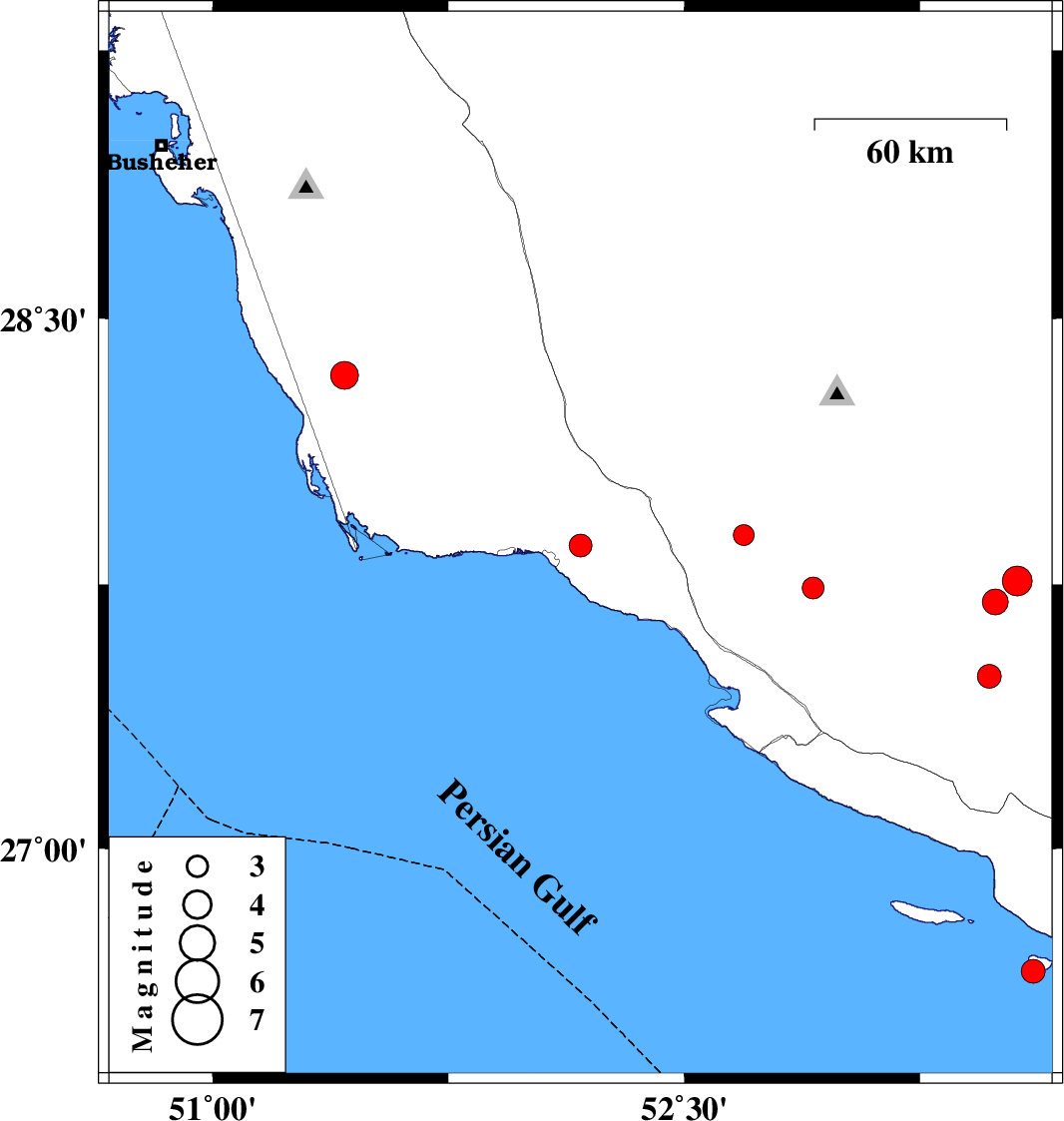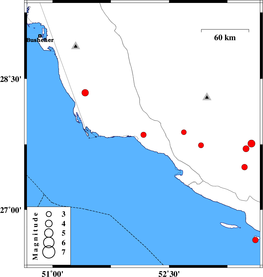 | 2008/03/07 | 20:27:00.5 | 23:57:00.5 | 27.86 | 52.17 | 19 | ML:3.2 | 11 km East of Bandar-e kangan, Bushehr Province | ||