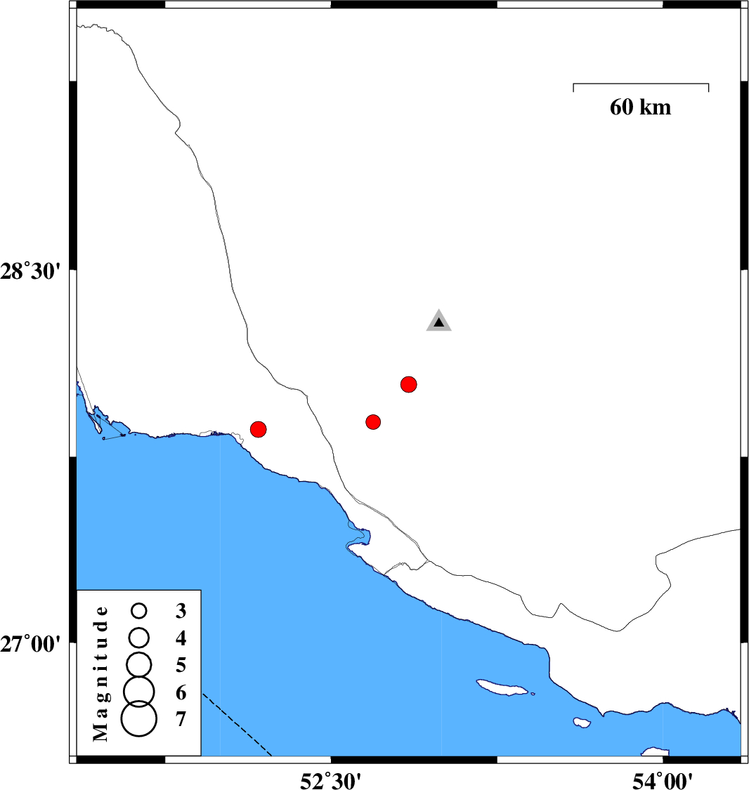 2008/03/07 | 05:54:11.1 | 09:24:11.1 | 27.89 | 52.69 | 0 | ML:3 | 37 km East of Jam, Bushehr Province |