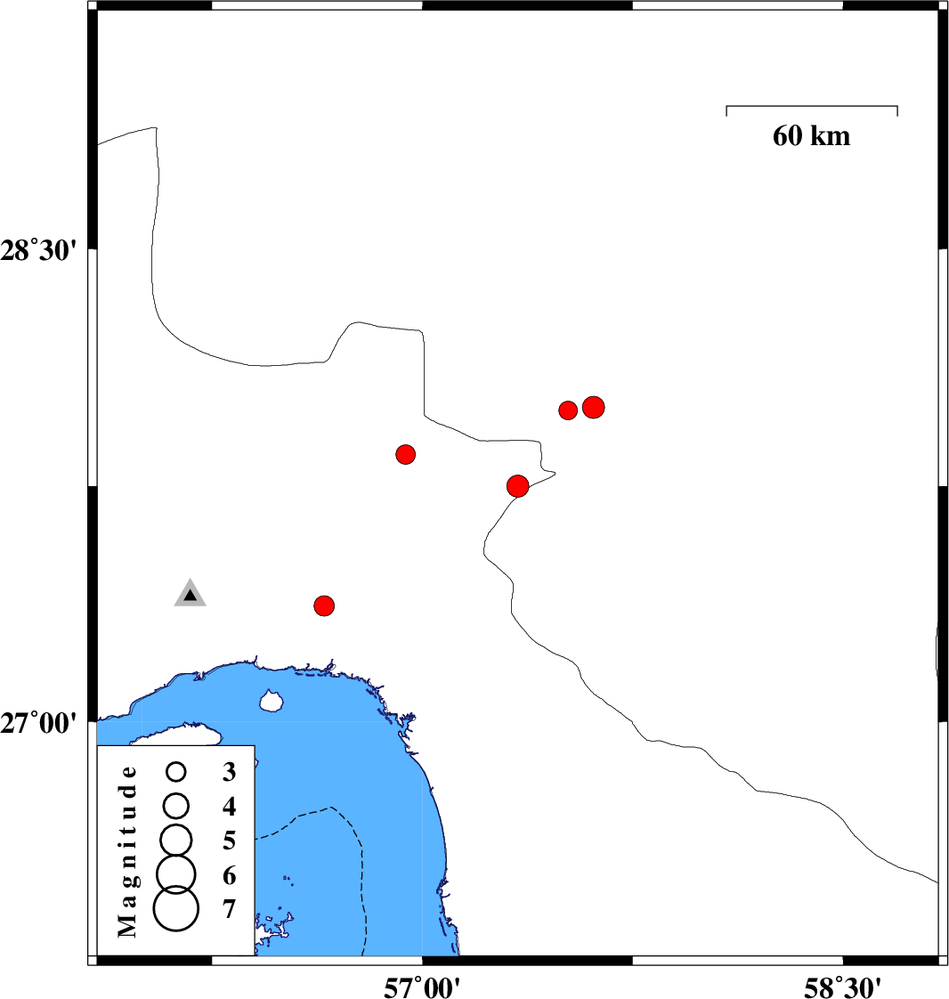 | 2008/03/11 | 14:03:46.4 | 17:33:46.4 | 27.75 | 57.34 | 38 | ML:3.5 | 37 km North-East of Dehbarez, Hormozgan Province | ||