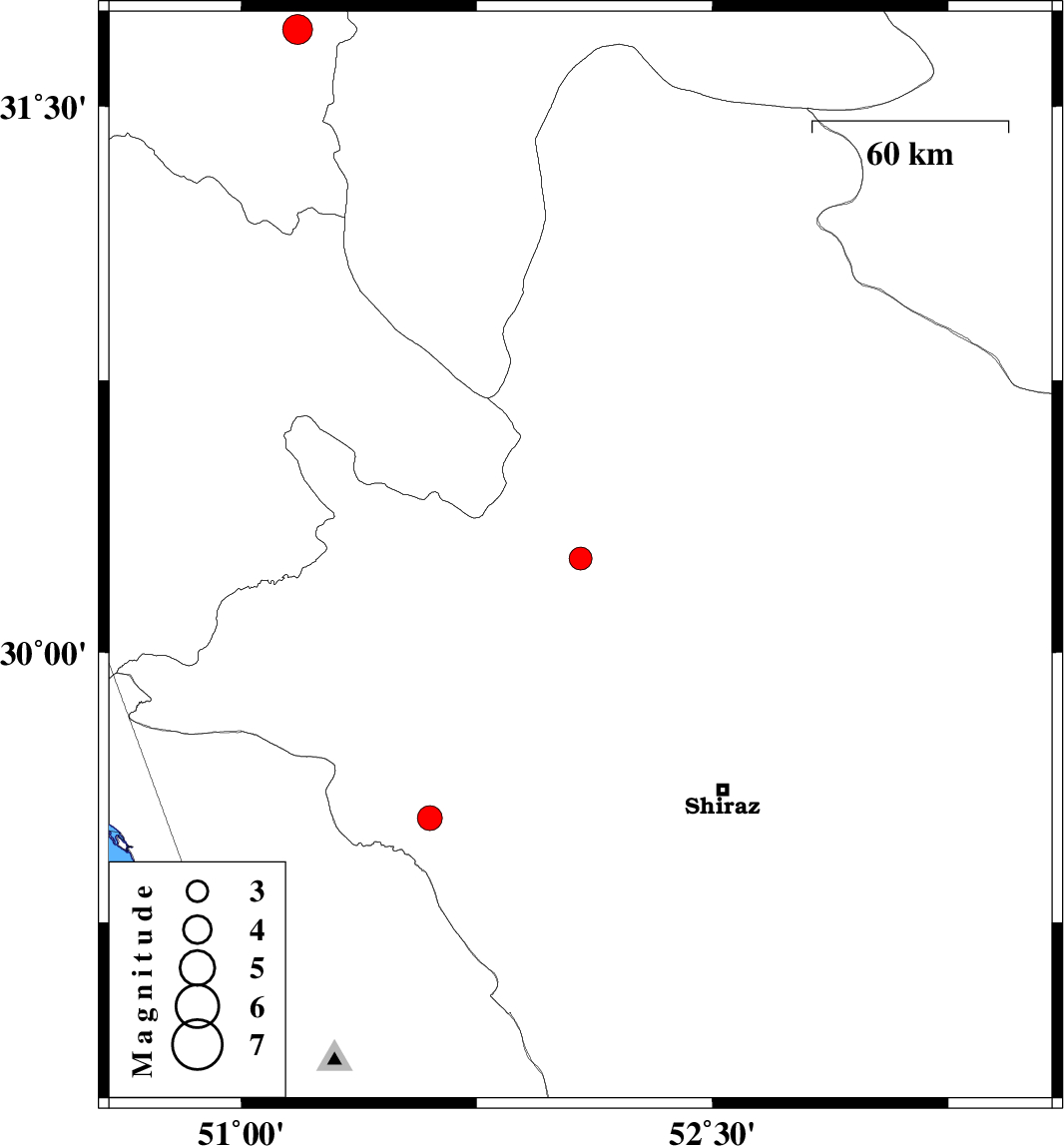 | 2008/02/28 | 01:01:45.9 | 04:31:45.9 | 29.54 | 51.6 | 14 | ML:3.5 | 10 km Kazerun, Fars Province | ||
