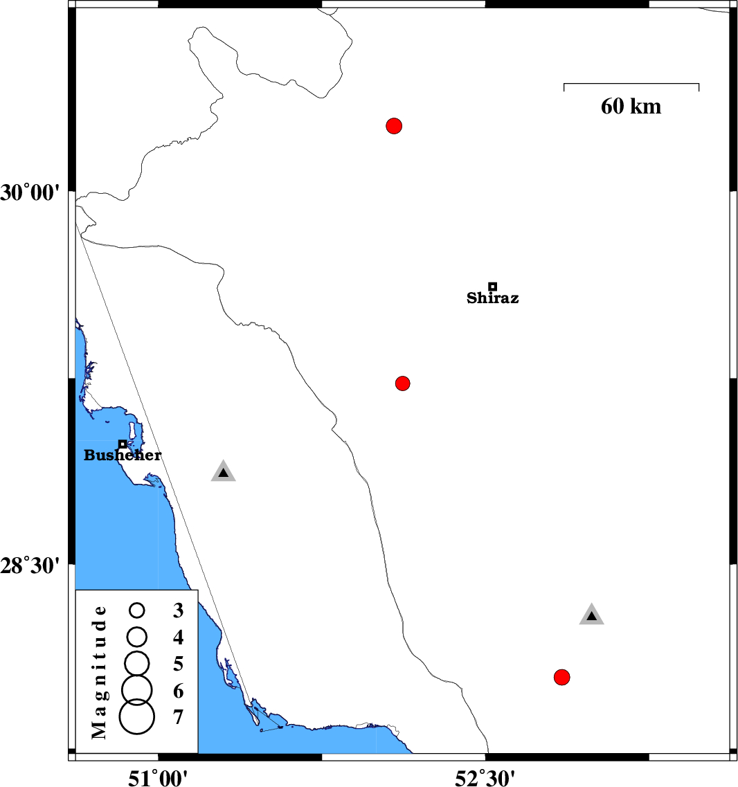 | 2008/03/10 | 01:41:35.4 | 05:11:35.4 | 28.04 | 52.85 | 27 | ML:3.3 | 50 km South-West of Qir va Karzin, Fars Province |