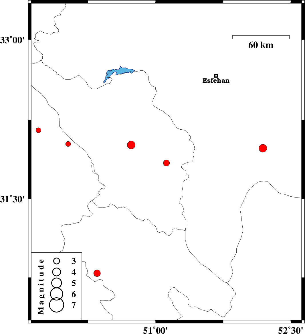 | 2008/03/19 | 08:15:26.1 | 11:45:26.1 | 31.98 | 52.19 | 14 | ML:4 | 30 km East of Shahreza, Esfahan Province | ||
