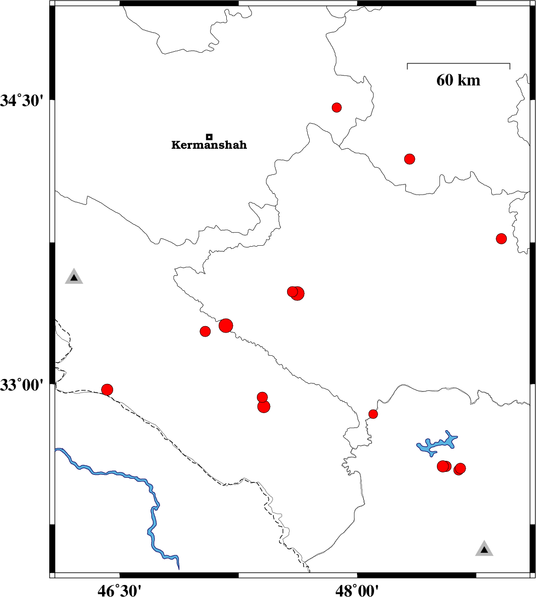 2008/03/04 | 19:36:29.3 | 23:06:29.3 | 33.77 | 48.91 | 18 | ML:2.9 | 19 km South-East of Borujerd, Lorestan Province | ||