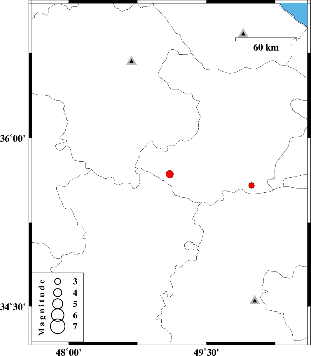 | 2008/03/27 | 06:48:58.3 | 11:18:58.3 | 35.68 | 49.1 | 14 | ML:3.7 | 32 km North of Razan, Hamedan Province | ||