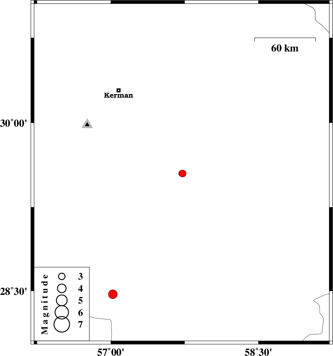 | 2008/03/27 | 19:21:55.4 | 23:51:55.4 | 29.55 | 57.73 | 14 | ML:3.2 | 78 km North-West of Bam, Kerman Province | ||