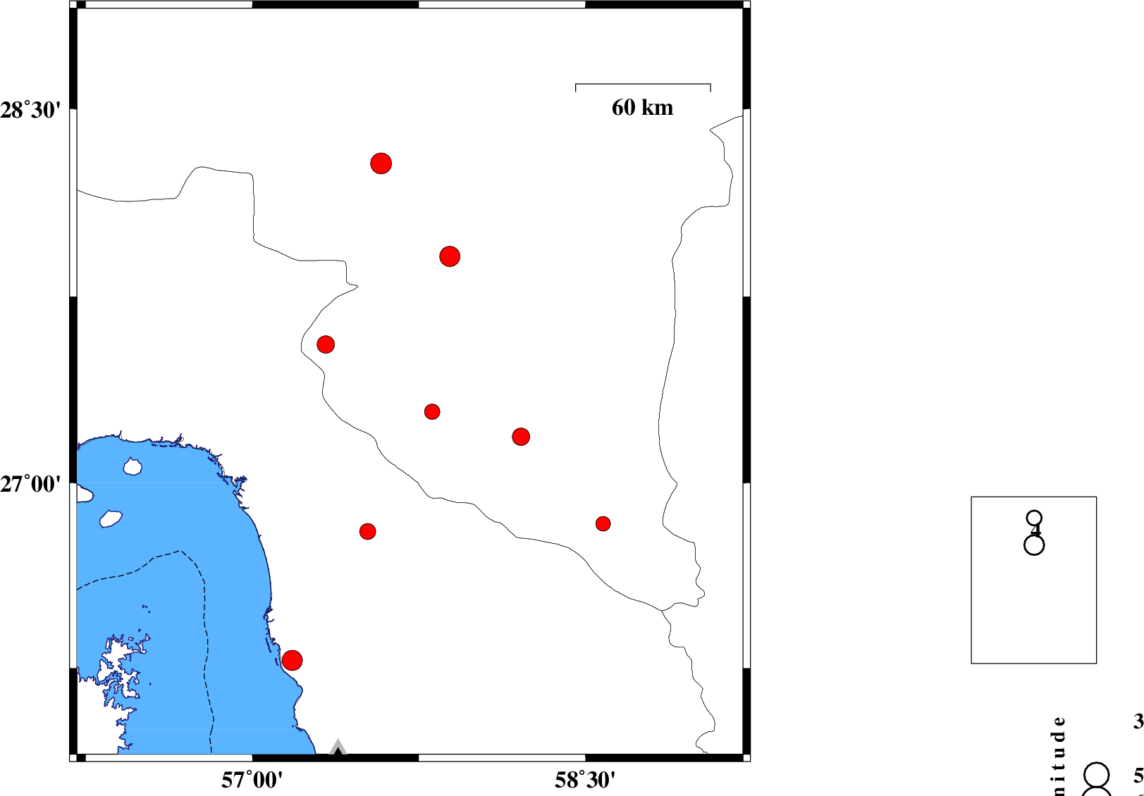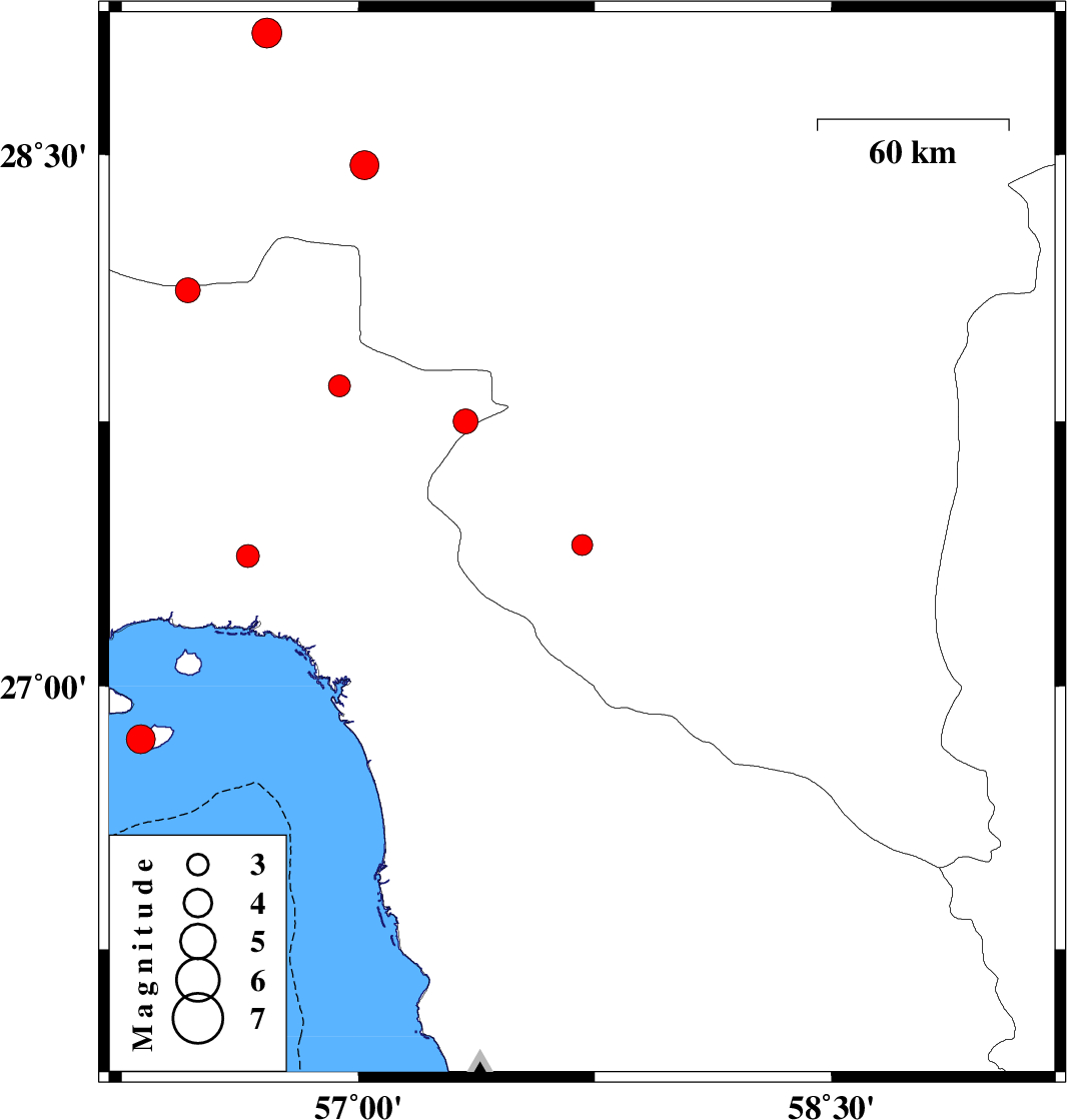 | 2008/03/11 | 14:03:46.4 | 17:33:46.4 | 27.75 | 57.34 | 38 | ML:3.5 | 37 km North-East of Dehbarez, Hormozgan Province | ||