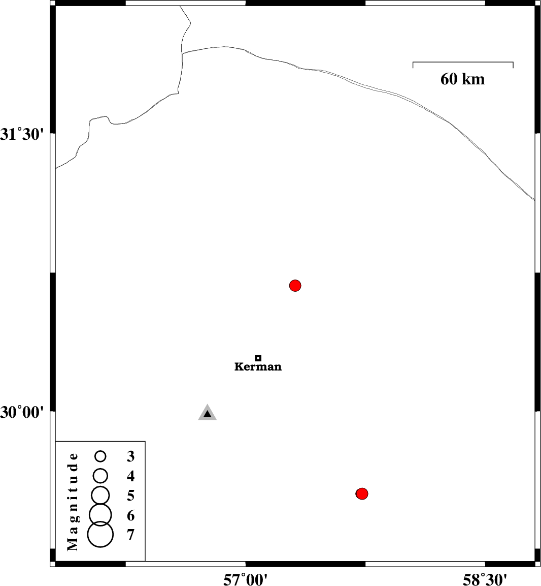 | 2008/03/27 | 19:17:37.9 | 23:47:37.9 | 29.55 | 57.72 | 14 | ML:2.8 | 79 km North-West of Bam, Kerman Province |