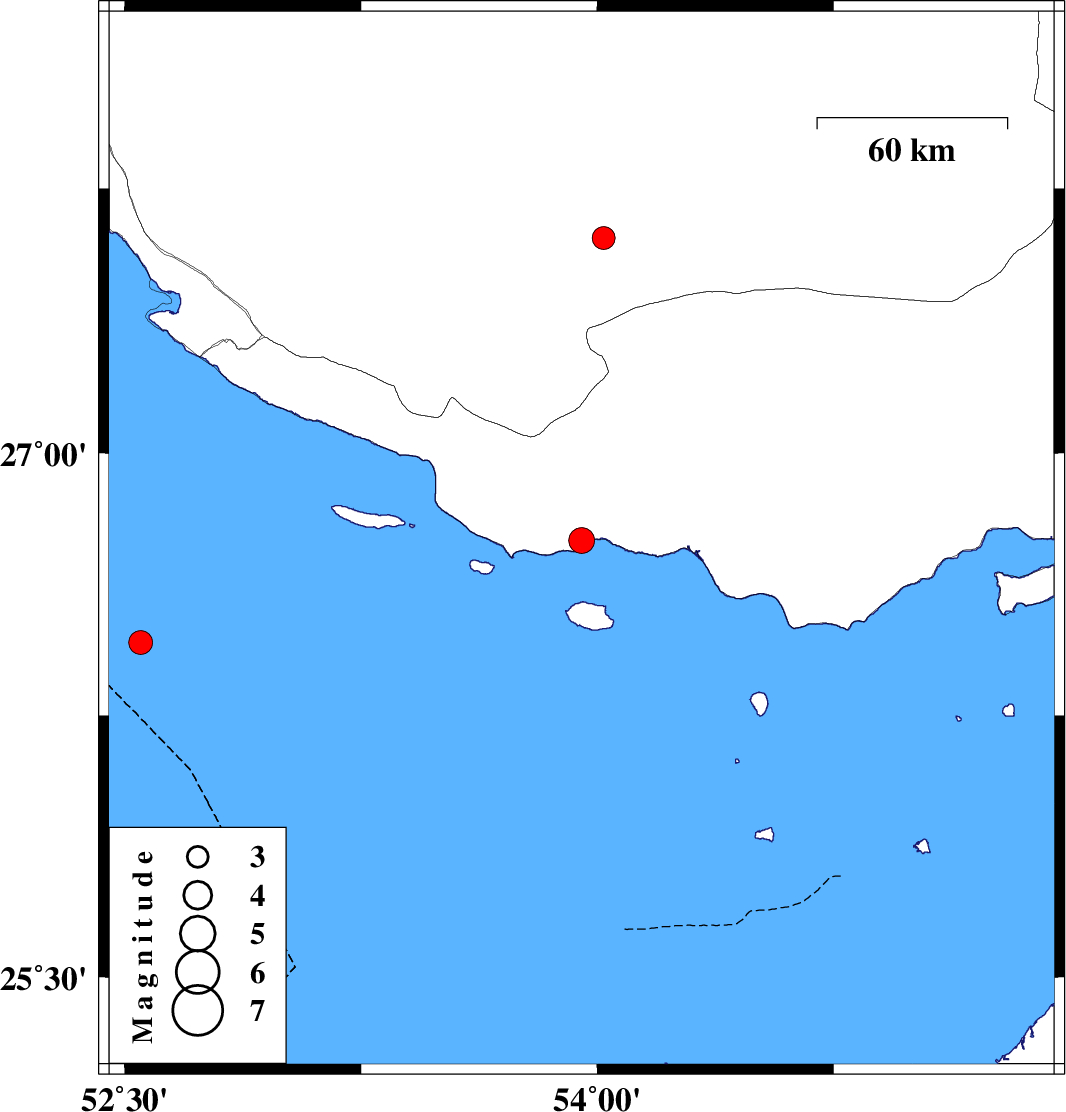 | 2008/03/31 | 11:07:32.0 | 15:37:32.0 | 27.61 | 54.02 | 15 | ML:3.3 | 32 km West of Lar, Fars Province |