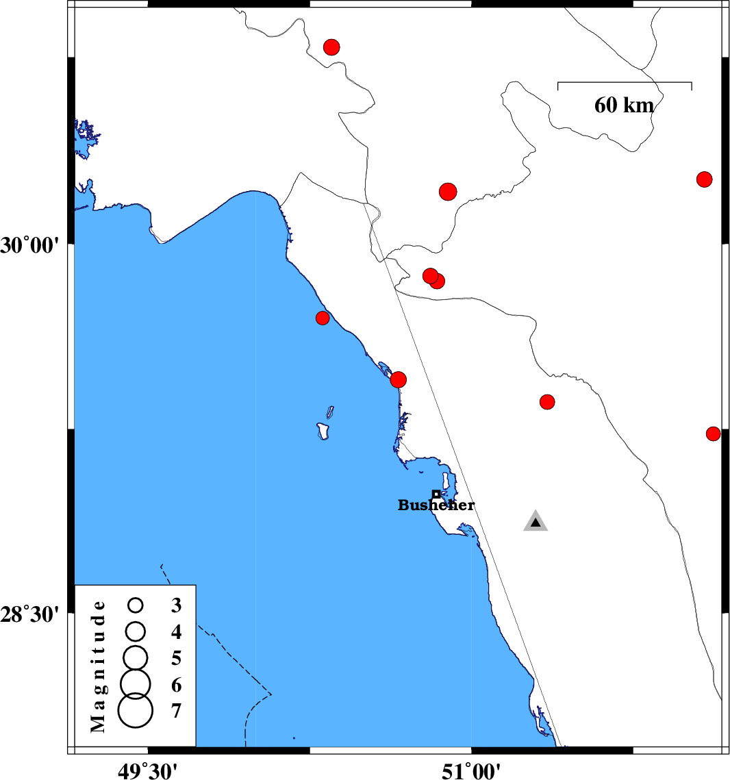 | 2008/03/24 | 18:56:26.1 | 23:26:26.1 | 29.7 | 50.31 | 14 | ML:2.8 | Persian Gulf, 23 km North-West of Bandar-e genaveh | ||