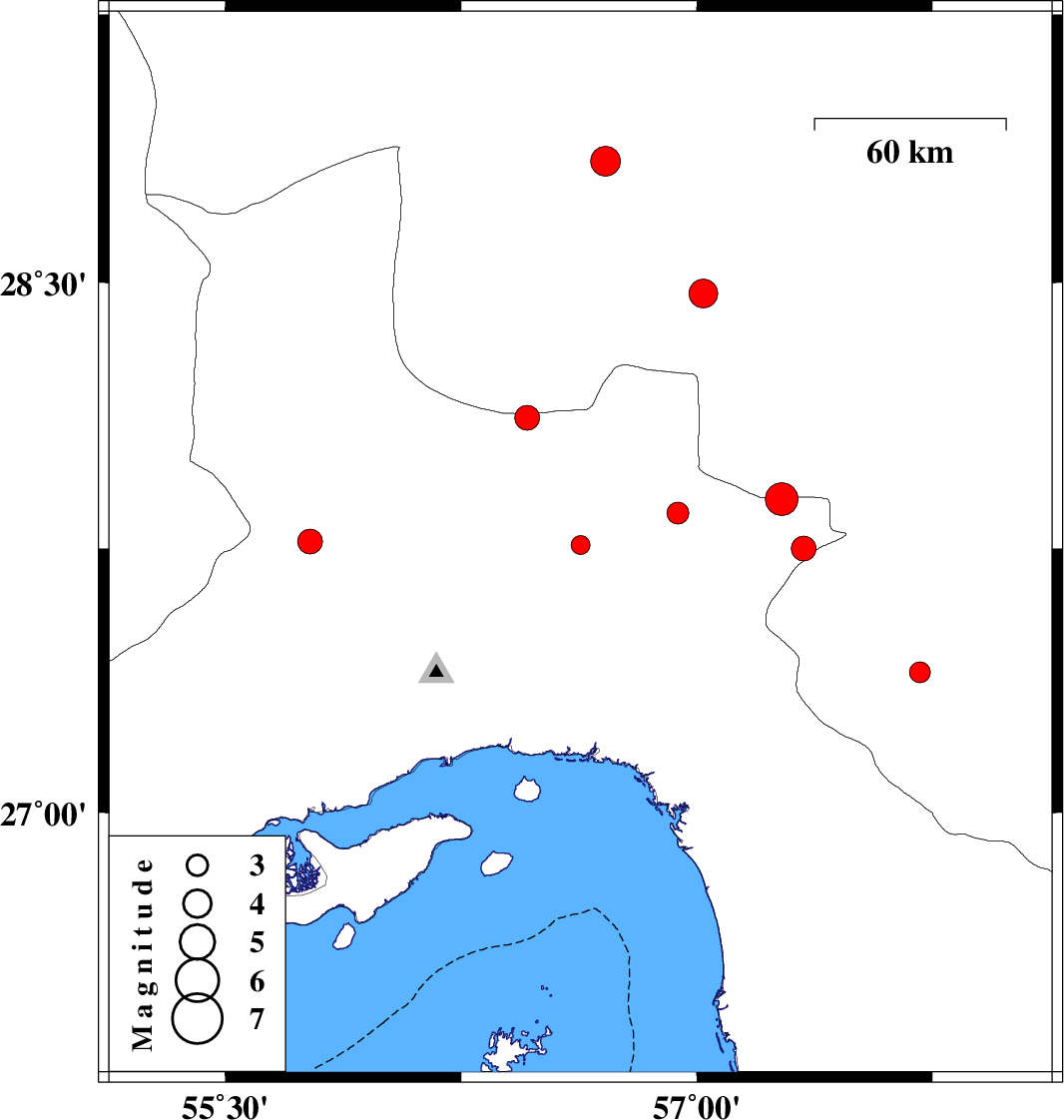 | 2008/03/11 | 14:03:46.4 | 17:33:46.4 | 27.75 | 57.34 | 38 | ML:3.5 | 37 km North-East of Dehbarez, Hormozgan Province | ||