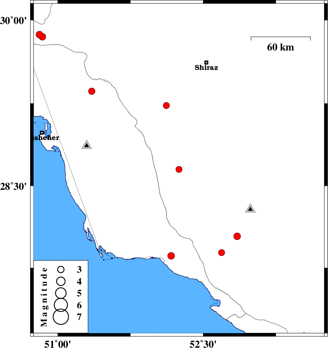 | 2008/03/29 | 17:45:33.2 | 22:15:33.2 | 29.85 | 50.84 | 15 | ML:3.2 | 43 km North-East of Bandar-e genaveh, Bushehr Province | ||