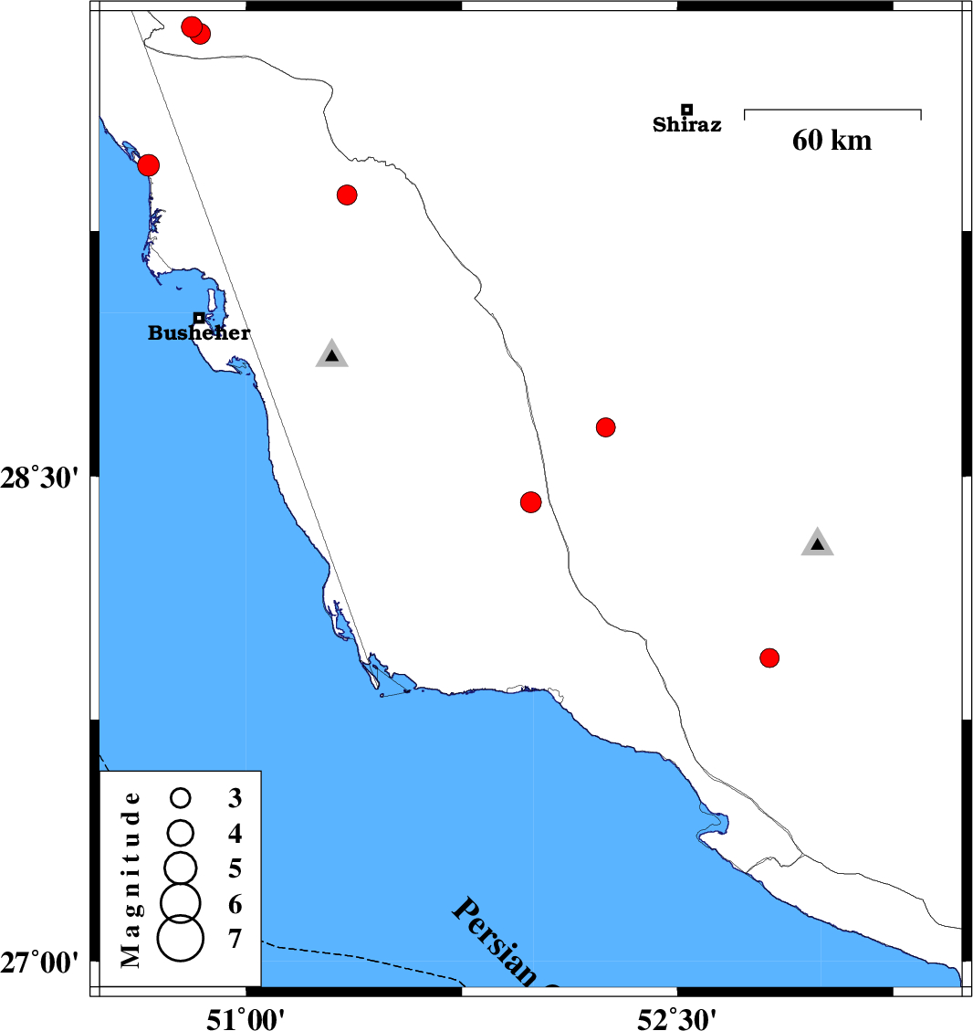 | 2008/03/24 | 01:25:05.6 | 05:55:05.6 | 29.36 | 51.35 | 15 | ML:3.1 | 17 km East of Borazjan, Bushehr Province |