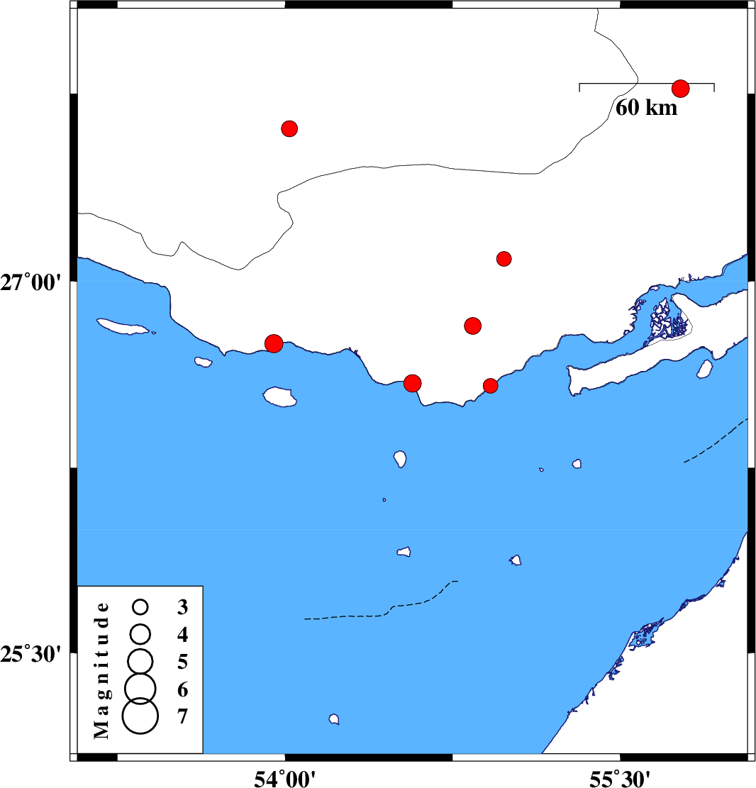 | 2008/04/20 | 04:55:09.3 | 09:25:09.3 | 26.59 | 54.57 | 14 | ML:3.5 | 28 km West of Bandar-e lengeh, Hormozgan Province | ||